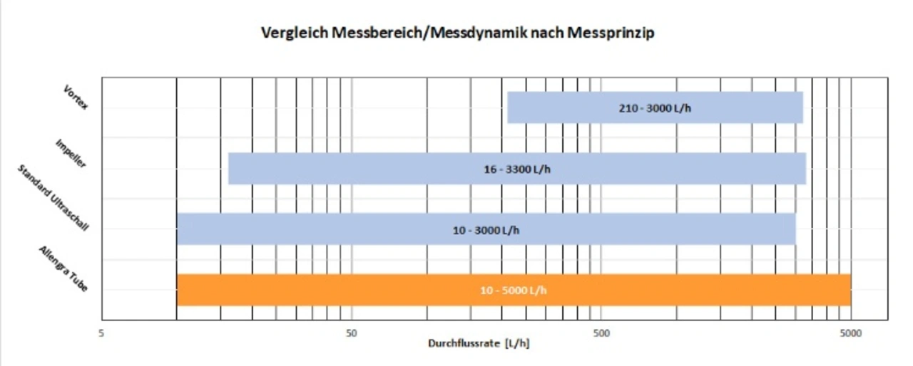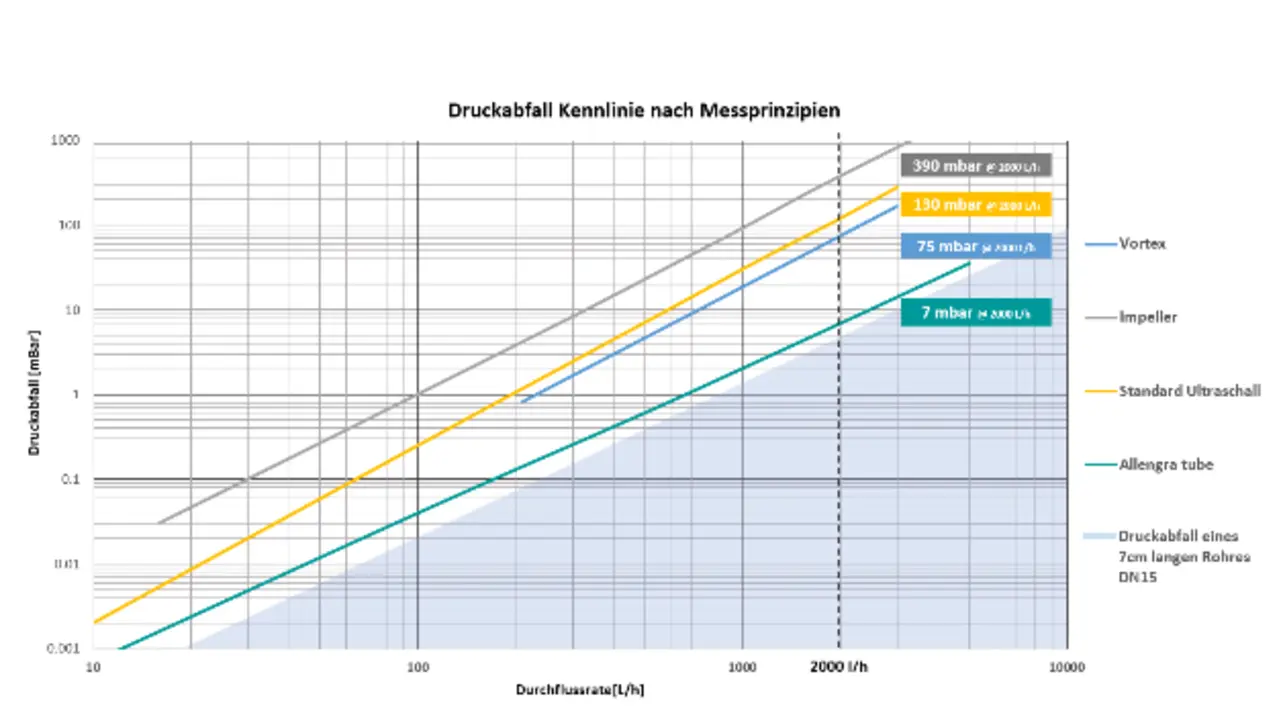 Allengra hat in einer aktuellen Studie den Einfluss auf den Druckabfall bei unterschiedlichen auf dem Markt befindlichen Durchflussmessern untersucht. Neben dem Impeller (390 mbar) lagen auch Vortex-Modelle (75 mbar) über dem aktuell von Allengra realisierten Wert. Selbst handelsübliche Ultraschall-Durchflusssensoren kommen noch auf 130 mbar. Die neuen Durchflussmesser-Lösungen werden im Full-Bore-Design gefertigt und bieten dem Wasserdurchfluss keinen Widerstand mehr durch Bauteile, haben keine Ruhestrecke und können wie ein normaler Rohrabschnitt behandelt werden. Dazu kommt eine geringe Geräuschemission und eine hohe Messsicherheit, auch bei Systemen mit eingeschlossenen Luftblasen.