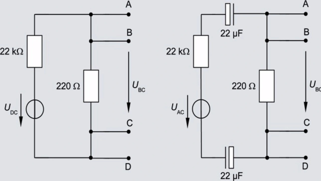 Für die Untersuchung der Störfestigkeit wird die Störspannungsquelle mit einem 22-kΩ-Widerstand in Reihe parallel zum Prüfling geschaltet (Bild 4). Zwei Elektrolyt-Kondensatoren entkoppeln, um die AC-Störer zu untersuchen. Man vergleicht Messungen mit einer Störspannung (UDC +20 V oder –20 V) mit Messungen ohne Störung. Während im ungestörten Betrieb die Spannung zwischen den Punkten