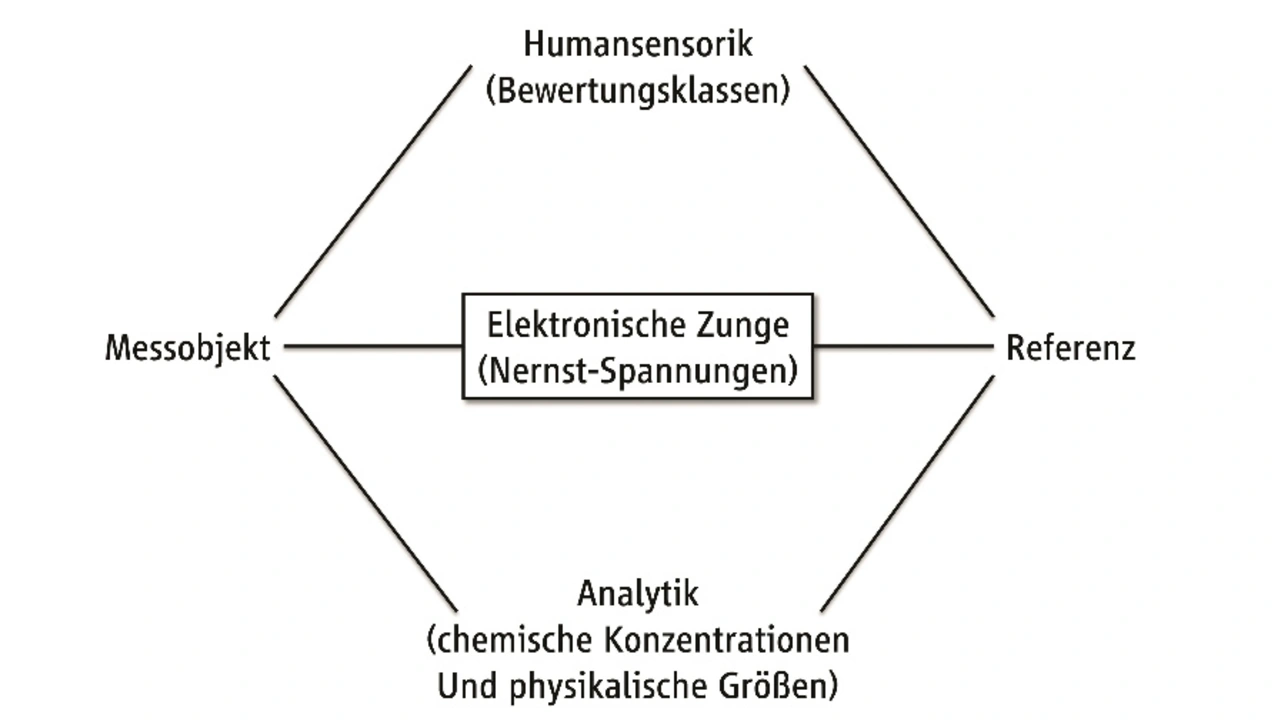 Wer den Aufwand scheut, könnte die elektronische Zunge von Multisensoric nutzen [4–6]. Dieses Taschengerät muss das Messobjekt nur kurz berühren. Dann stehen an den Messelektroden elektrische Spannungen an, die die Vektorkomponenten darstellen und den Zustand beschreiben, von dem der (subjektive) Geschmack herrührt. Auch diese Zustandsbeschreibung ist objektiv. Die humansensorische Zustandsbeschreibung lässt sich, wenn sie mit Maßzahlen wie Zensuren, Bewertungsklassen oder Güteklassen als Vektorkomponenten arbeitet, ebenfalls in Vektoren beschreiben. Damit lässt sich diese Zustandsbeschreibung auch in eine Objektivierungsmethode einbinden.