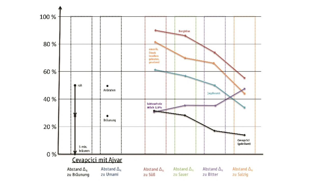 Zur Demonstration dieser Methode wurden Ćevapčići ausgewählt, Hackfleischröllchen aus der serbokroatischen Küche. Als Referenz dienten Umami (Glutamat), die vier Grundgeschmacksrichtungen (süß/Saccharose, salzig/Natriumchlorid, sauer/Zitronensäure, bitter/Koffein) und als Zielgröße die Bräunung beim Braten (1 Min. scharf anbraten, 5 Min. auf kleiner Heizstufe ohne Fett weiter braten für eine abgetrennte Scheibe, bis Bräunung eintritt).