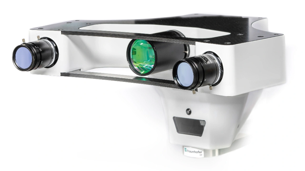 Das 3D-SWIR-System basiert auf einer Technologie, die seit Jahren am Fraunhofer IOF stetig weiterentwickelt wird. Im Rahmen dieser Arbeiten wurden auch Möglichkeiten geschaffen, um 2D- und 3D-Aufnahmen effektiv zu kombinieren. Beispielsweise kann eine einzelne Kamera im sichtbaren Bereich zum 3D-SWIR-Sensor hinzugefügt werden. Mit einer darauf optimierten Software können deren 2D-Daten als Netz über die 3D-Daten der stereo- skopischen Aufnahme gelegt werden. So lassen sich einerseits Texturdaten einbinden. Oder man kann bei Bedarf mit einer Thermokamera auch Temperaturdaten hinzufügen.