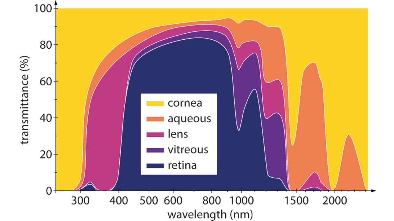 Zum einen ist im Bereich von 1.400 bis 1.500 nm die Transmission des menschlichen Auges nahezu null (Bild 2). Deshalb gilt der Bereich als augensicher. Daneben ist das Sonnenlicht in diesem Bereich relativ schwach, sodass bei Tageslicht nur wenig störende Hintergrundstrahlung zu erwarten ist.