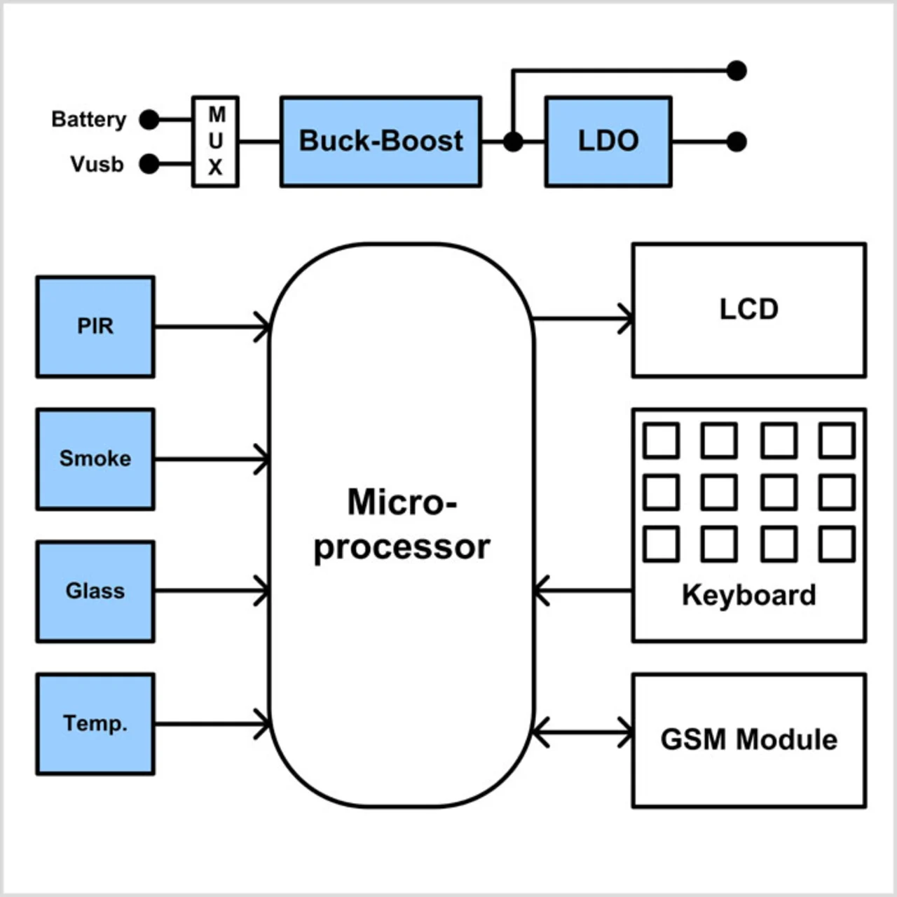 Die Struktur einer Heim-Alarmanlage geht aus Bild 1 hervor. »Man erkennt die verschiedenen, per Kabel oder drahtlos angeschlossenen Sensoren, den Mikrocontroller, das GSM-Modul und den Power-Management-Abschnitt«, erklärt Alberti. »Es kommen unterschiedlichste Sensoren in Frage, z.B. Bewegungsmelder auf PIR-Basis (pyroelektrische Infrarot-Technik), Tür oder Glassensoren, Gasmelder, Temperaturfühler oder Rauchmelder. Wie das Blockschaltbild weiter zeigt, kann die Anlage entweder aus einem USB-Port oder aus einer Batterie versorgt werden. Daraus resultiert die Forderung nach minimaler Stromaufnahme für eine maximale Batterielebensdauer.« Die für die verschiedenen Funktionsabschnitte der Anlage nötigen Spannungen lassen sich mit dem Buck/Boost-DC-DC-Wandler LM3668 und dem rauscharmen LDO-Spannungsregler LP5900 erzeugen. Zur Temperaturerfassung eignet sich der analoge Temperatursensor LM94022, der aufgrund seiner geringen Stromaufnahme von typ. 5,4 µA und seiner Eignung für Versorgungsspannungen ab 1,5 V für alle Systeme in Frage kommt, in denen die Stromaufnahme möglichst niedrig sein muss.
