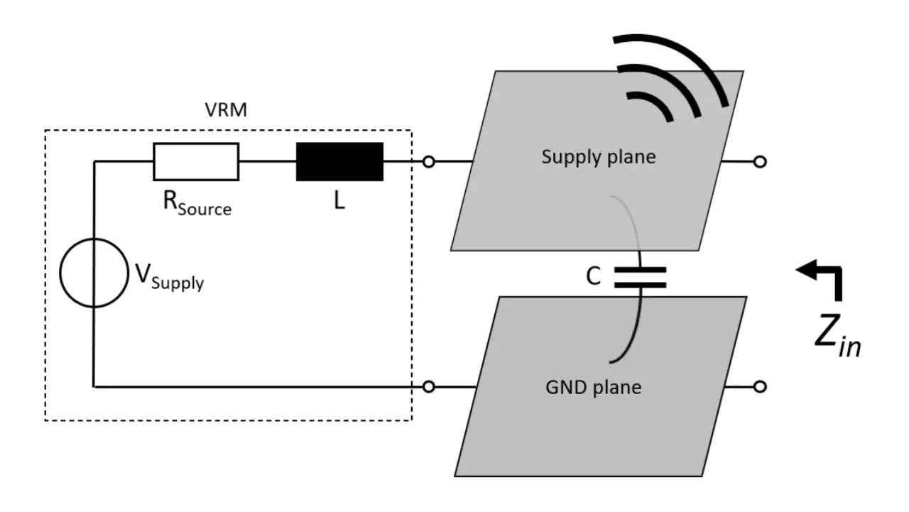 Beispiel: Eine typische Spannungsversorgungssektion auf einer Leiterplatte. Dort ist in aller Regel ein VRM (Voltage Regulator Module) zu finden, häufig mit schaltendem Abwärtswandler mit hoher Ausgangsinduktivität L. Der Einfachheit halber wird das VRM als ideale Spannungsquelle mit in Serie geschaltetem Innenwiderstand RSource betrachtet. Typischerweise wird die Spannung über große Metallflächen zu den zu versorgenden ICs (Integrated Circuits) verteilt, wobei eine Metallfläche die Versorgungsspannung trägt und eine andere den Referenzpegel, häuft als Masse (GND) bezeichnet. Diese zwei Flächen entsprechen einem Parallelplattenkondensator mit einer Kapazität C. Zusammen bilden RSource, L und C einen Parallelschwingkreis (Bild 2).