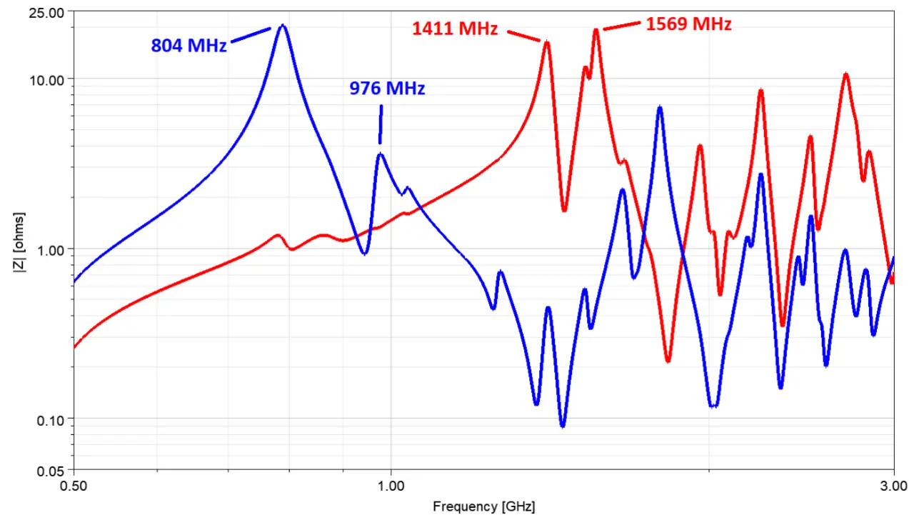 Bild 3 zeigt ein typisches Impedanzprofil, gemessen zwischen einem Versorgungsnetz und GND an verschiedenen Positionen auf dem PCB. Die Position der Messung wirkt sich auf die Höhe des Maximums aus, nicht aber auf dessen Frequenz. Grund für die positionsabhängige Impedanz ist die stehende Welle (Spannungs- und Stromverteilung) entlang dieser Flächen, vergleichbar der eines strahlenden Antennenstabs.
