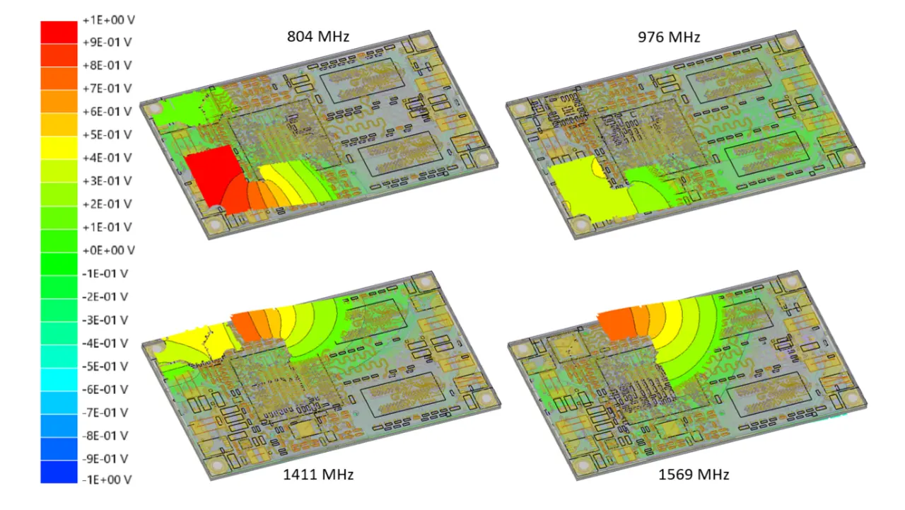 State-of-the-art Simulationssoftware wie Ansys SIwave bringt zudem Visualisierungsmöglichkeiten für die Spannungs- und Stromverteilungen von Resonanzen. Dabei können per Ein-Klick-Lösung PCBs auf Resonanzen untersucht und die stehenden Wellen als Ausgangspunkt für Abstrahlung visualisiert werden. Bild 4 zeigt die so simulierten Spannungsverteilungen der in Bild 3 markierten Resonanzen. Sind diese Verteilungen bekannt, lassen sich Maßnahmen zur Unterdrückung der Resonanzen ableiten.