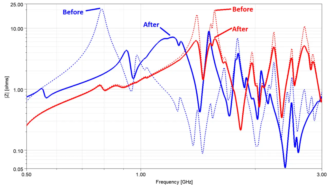 Die durch Simulationen erworbene Kenntnis über das Aussehen der Antennen ist ein guter Startpunkt, um sie zu eliminieren. Dabei gibt es zwei Ansätze. Zum einen können die Resonanzen durch Einfügen einer resistiven Komponente (z.B. ein Widerstand oder der parasitäre Widerstand eines Kondensators) gedämpft werden. Dadurch würde Leistung in diesem Widerstand “verbrannt”, statt abgestrahlt. Alternativ kann die Antenne gezielt durch Änderung von L oder C verstimmt werden, was über die Änderung der Länge der Antennenarme bzw. Flächen erfolgt, indem diese elektrisch kurzgeschlossen werden. Im Falle von Flächen gleichen Potentials (zwei GND-Flächen) kann das Kurzschließen durch “Stitching Vias” erfolgen. Das würde einer Reduzierung der Loop-Induktivität L entsprechen und die Resonanzfrequenz erhöhen.