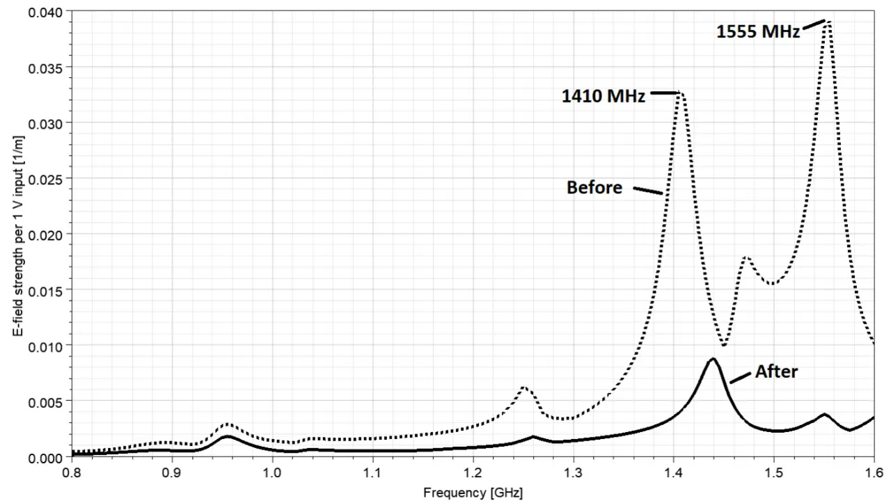 Bild 6 zeigt die simulierte elektrische Feldstärke (Maximalwert über alle Raumrichtungen) im Fernfeld (Abstrahlung). Die erhöhten Feldstärkewerte sind auf die Resonanzen zurückzuführen, die in der Simulation mit 1 Volt frequenzunabhängig (konstantes Spektrum) angeregt wurden. Die Positionen der Maxima entsprechen etwa den zuvor simulierten Resonanzfrequenzen aus Bild 3. Besonders die beiden Moden oberhalb von 1 GHz tragen stark zur Abstrahlung bei. Mit dem im letzten Absatz beschriebenen Optimierungsansatz wird die Abstrahlung und somit gemessene Feldstärke deutlich reduziert.