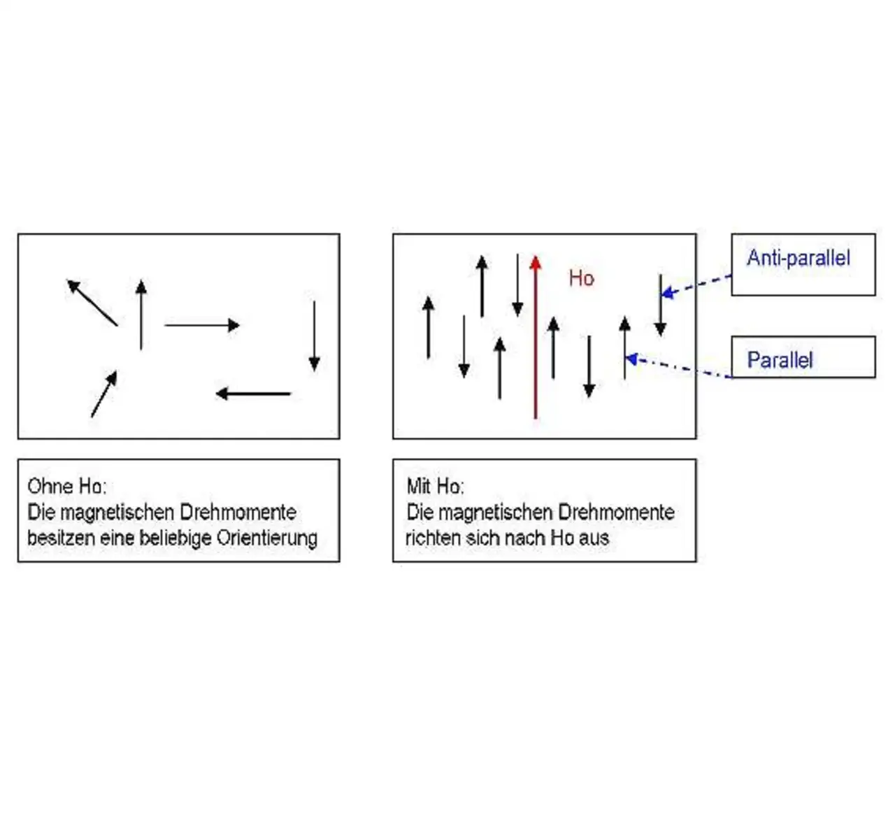 Sobald diese Magneten durch ein konstantes und homogenes statisches Magnetfeld (bezeichnet als H0) angeregt werden, richten sie sich auf H0 in einer von zwei Richtungen aus: parallel oder anti-parallel zum Feld.