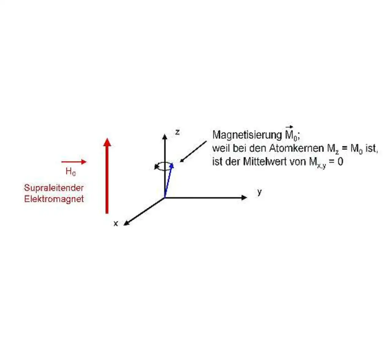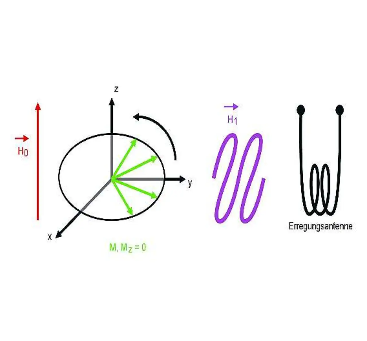 Sobald H1 angelegt ist, sind die Spin-Achsen der Atomkerne nicht mehr parallel zu H0 (Z-Achse), sondern bewegen sich auf der xy-Ebene.