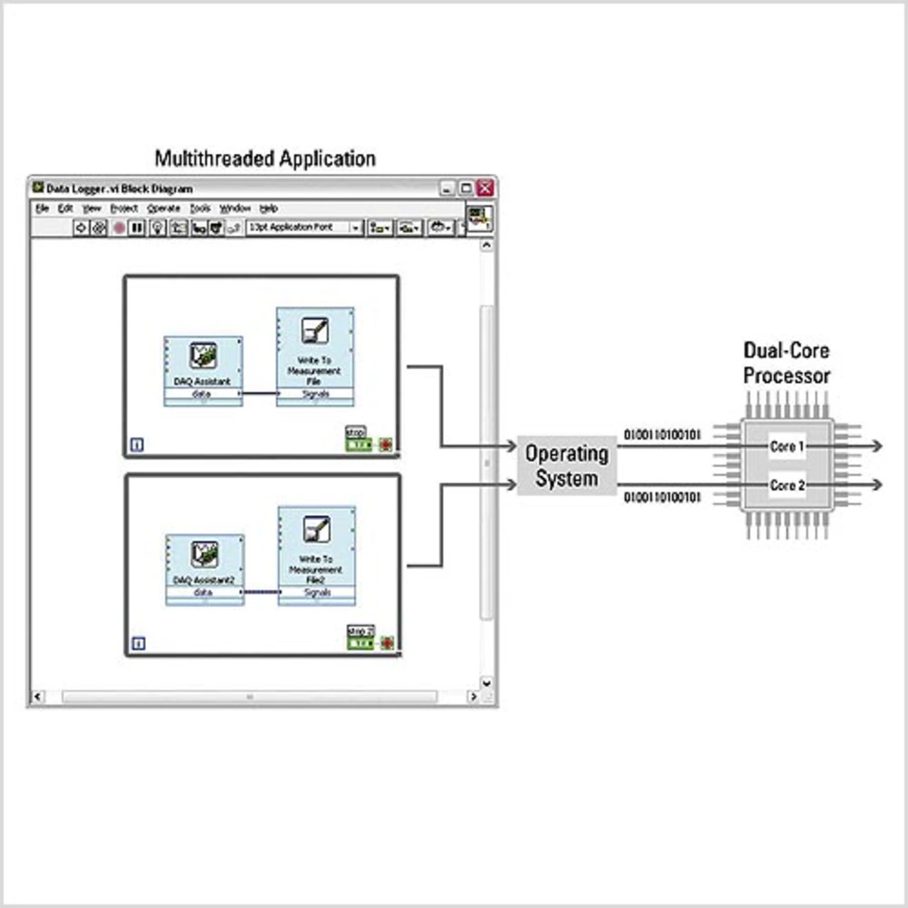 Das Programmpaket „LabVIEW“ beispielsweise führt Programmcode bereits von selbst parallel aus. Eine einzelne Schleife spricht einen Core an, mehrere parallel ablaufende Schleifen teilen die Aufgabe auf verschiedene Cores auf. Ein Anwender dieser Software muss somit nicht seinen Programmcode umschreiben, um von den Vorteilen der Multicore-Technologie profitieren zu können (Bild 3).