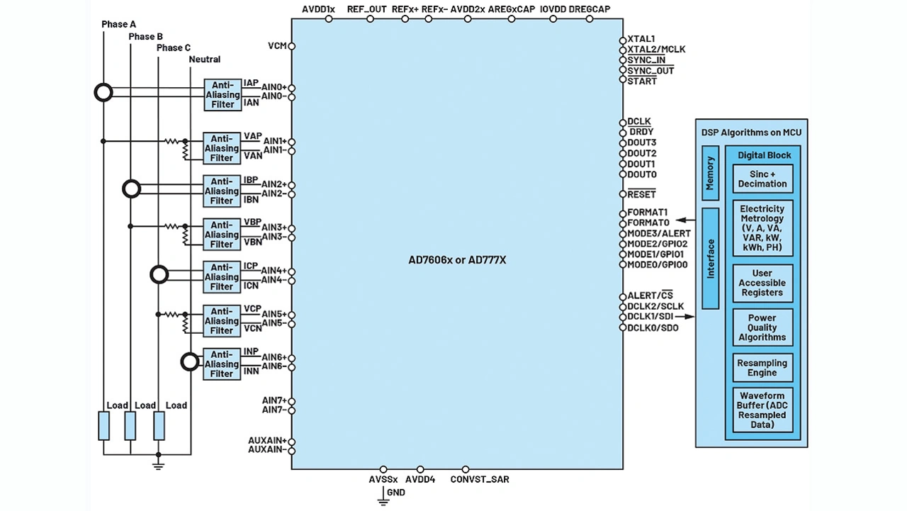 Zur Anpassung an unterschiedliche Sensorausgangskonfigurationen sind die analogen Eingänge für differenzielle, pseudo-differenzielle und massebezogene Signale konfigurierbar. Ein Abtastratenwandler steht zur Verfügung, um eine feinstufige Auflösungskontrolle des AD7770 zu ermöglichen. Somit ist der Einsatz auch in Anwendungen möglich, in denen die Auflösung der Ausgangsdatenrate an Änderungen der Netzfrequenz in 0,01-Hz-Schritten angepasst werden muss. Die AD777x-Reihe bietet überdies eine große Eingangssignalbandbreite von 5 kHz (AD7771: 10 kHz).
