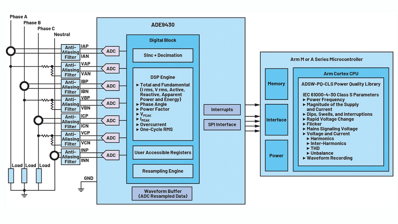 Die Softwarebibliothek ADSW-PQ-CLS ist eigens für die Integration mit dem ADE9430 ausgelegt, um Messungen der Spannungsqualität gemäß IEC 61000-4-30, Klasse S, durchzuführen. Sie implementiert sämtliche Parameter, die in der Norm IEC 61000-4-30 für Instrumente der Klasse S definiert sind. Welche Parameter für Spannungsqualität im Einzelnen genutzt werden sollen, bleibt dem Anwender überlassen. Die Bibliothek benötigt nur wenig CPU/RAM-Ressourcen und ist nicht auf bestimmte Prozessorkerne oder Betriebssysteme angewiesen (mindestens ARM Cortex-M). Zu den unterstützten CPU-Architekturen gehören die Kerne Arm Cortex-M0, Cortex-MO+, Cortex-M1, Cortex-M3 und Cortex-M4.