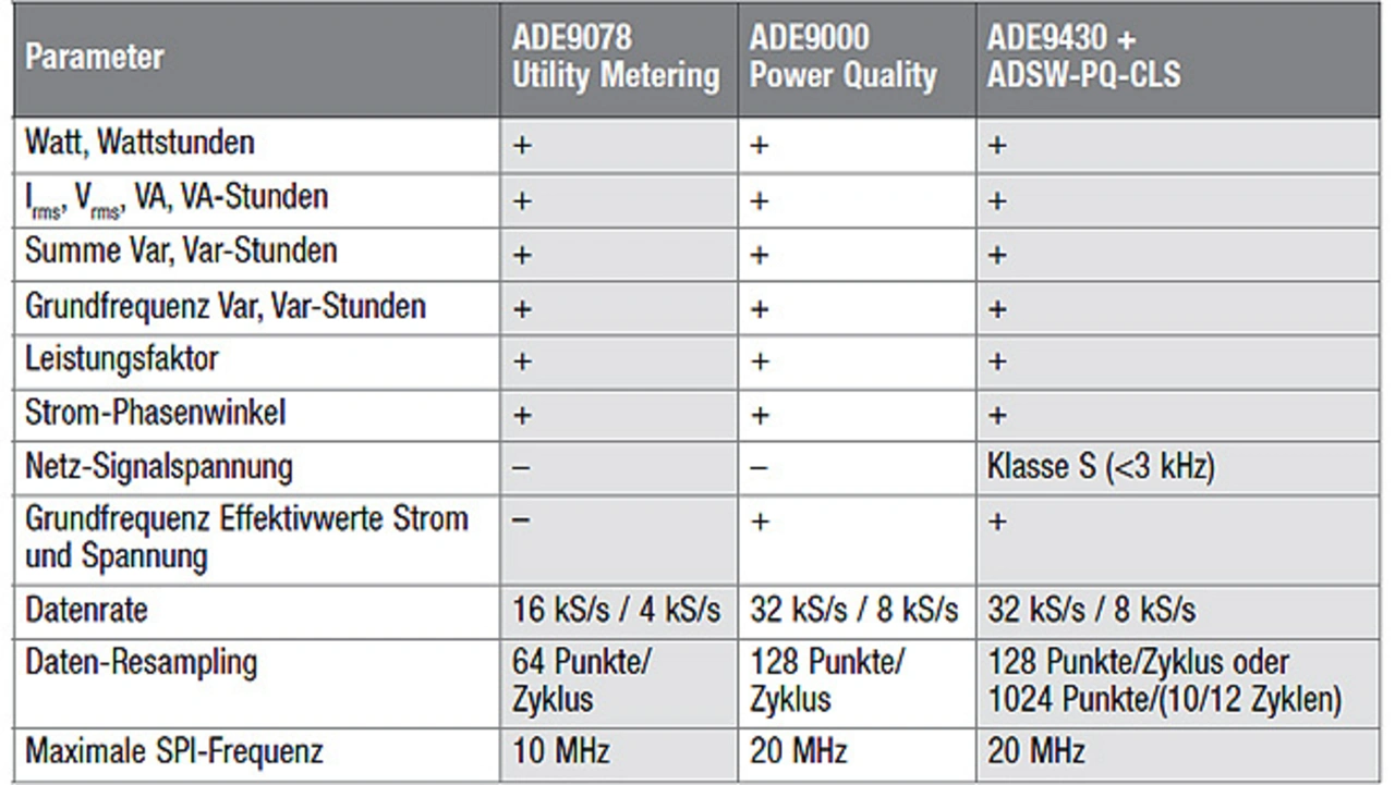 Das vollständig integrierte und mehrphasige Energiezähler-IC des Typs ADE9430 ergibt zusammen mit der auf einem Host-Mikrocontroller laufenden Softwarebibliothek ADSW-PQ-CLS eine Komplettlösung von Analog Devices gemäß IEC 61000-4-30, Klasse S (Tabelle 2).