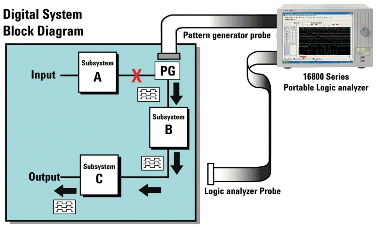 Wenn die Entwickler, die das Subsystem B entwickeln, Messungen durchführen wollen, bevor die Subsysteme A und C fertig sind, kann ein Bitmustergenerator das Eingangssignal für Subsystem B liefern und ein Logikanalysator sein Ausgangssignal erfassen. Prinzipiell ist es mit dieser Methode möglich, jedes theoretisch mögliche Eingangssignal durchzutesten und das zugehörige Ausgangssignal zu beobachten. In kleineren Systemen ist es möglich, eine Tabelle aller möglicher Eingangssignale mit den zugehörigen Ausgangssignalen aufzustellen und dann alle durchzutesten.