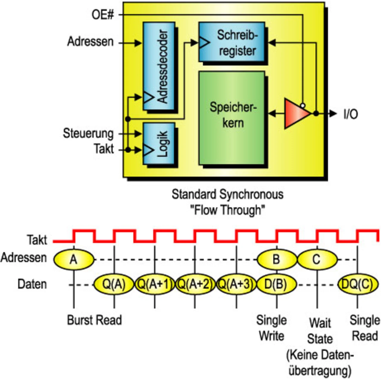 Sämtliche synchronen SRAMs besitzen Eingangsregister, die zur Erfassung der synchronen Eingangssignale des Bausteins (Address, Data und Control) dienen. Bei Flow-Through-SRAMs sind nur die Eingänge mit Registern versehen. Sind die Address- und Steuer-Eingänge erfasst und wird ein Lesezugriff initiiert, so können die entsprechenden Daten direkt an die Ausgänge gelangen. Die Flow-Through-Architektur (Bild 2) wird bevorzugt, wenn die Anfangs-Latenzzeit (Time to First Data) wichtiger ist als die Langzeit-Bandbreite (Mbit/s).