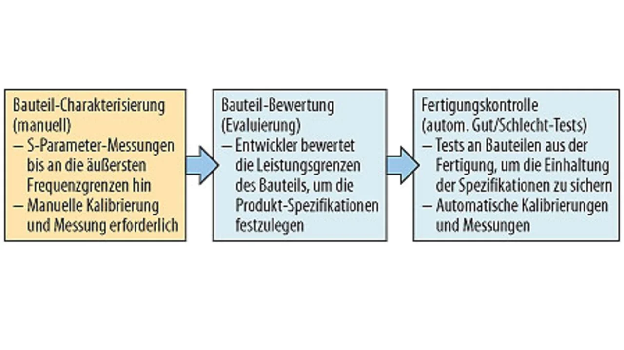 Hersteller von Halbleitern charakterisieren und testen Transistoren, z.B. für Leistungsverstärker, aber auch für kompliziertere integrierte Systeme (MMICs). Bild 1 zeigt die dabei zu durchlaufenden, typischen Entwicklungsphasen: Bauteilcharakterisierung, Bewertung und die Phase der Fertigungskontrolle. Während einer ersten Bauteilcharakterisierungs-Phase wird ein Satz Primärdaten für die ersten Wafer benötigt. Dies soll helfen, die Spezifikation für das zukünftige Produkt festzulegen. Charakterisierungstechniker messen über einen breiten Frequenzbereich hinweg die gesamten S-Parameter auf mehreren Bauteilen für eine Vielzahl von Bias-Pegeln, Leistungspegeln und - in einigen Fällen - Temperaturen. Diese Messungen sind oft von ihrem Charakter her eher manuell und es ist erforderlich, dass die Sonden physisch um den Wafer herum bewegt werden müssen.