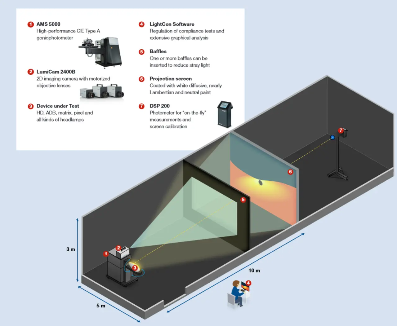 Das Testsystem ergänzt das klassische und präzise Vermessen von örtlichen Lichtverteilungen über ein Goniophotometer mit einer schnellen bildgebenden Erfassung. Konstruiert wurde es mit Blick auf die Anforderungen in der Entwicklung von modernen Scheinwerfern für das entwicklungsbegleitende Testen und Dokumentieren der Testergebnisse. Konformitätsbewertungen nach gängigen Normen (u.a. ECE, SAE, ICAO, FAA) sind über die Datenbank der LightCon-Software möglich. Das DSP 200 Photometer unterstützt die Vermessung von pulsweitenmodulierten Lichtquellen.