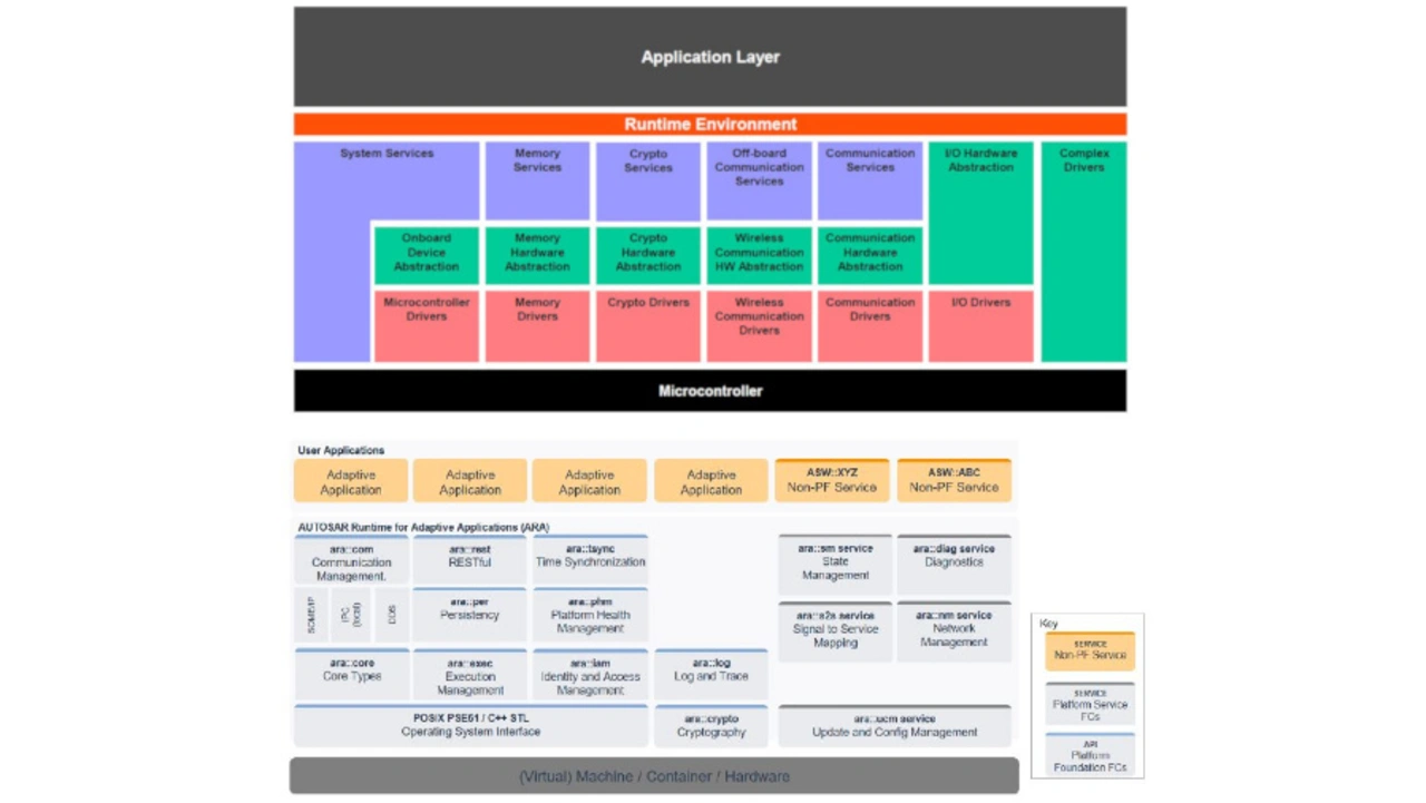 Die vorherige AUTOSAR-Architektur (Bild 3) war hauptsichtlich eine geschichtete Architektur für tief eingebettete Systeme, also für Systeme mit begrenzten Hardware-Ressourcen. Dort werden Programme ausschließlich aus dem eigenen Speicher unter statischer Konfiguration ausgeführt, die Kommunikation nutzt etablierte Fahrzeug-Bussysteme wie CAN, LIN, FlexRay und neuerdings auch das Ethernet. Es wurde im Grunde nicht für Steuergeräte ausgelegt, die nach der SOP-Phase eine regelmäßige Aktualisierung benötigen - etwa wegen kritischer Sicherheits-Patches oder um Fahrzeugfunktionen ergonomischer zu gestalten.