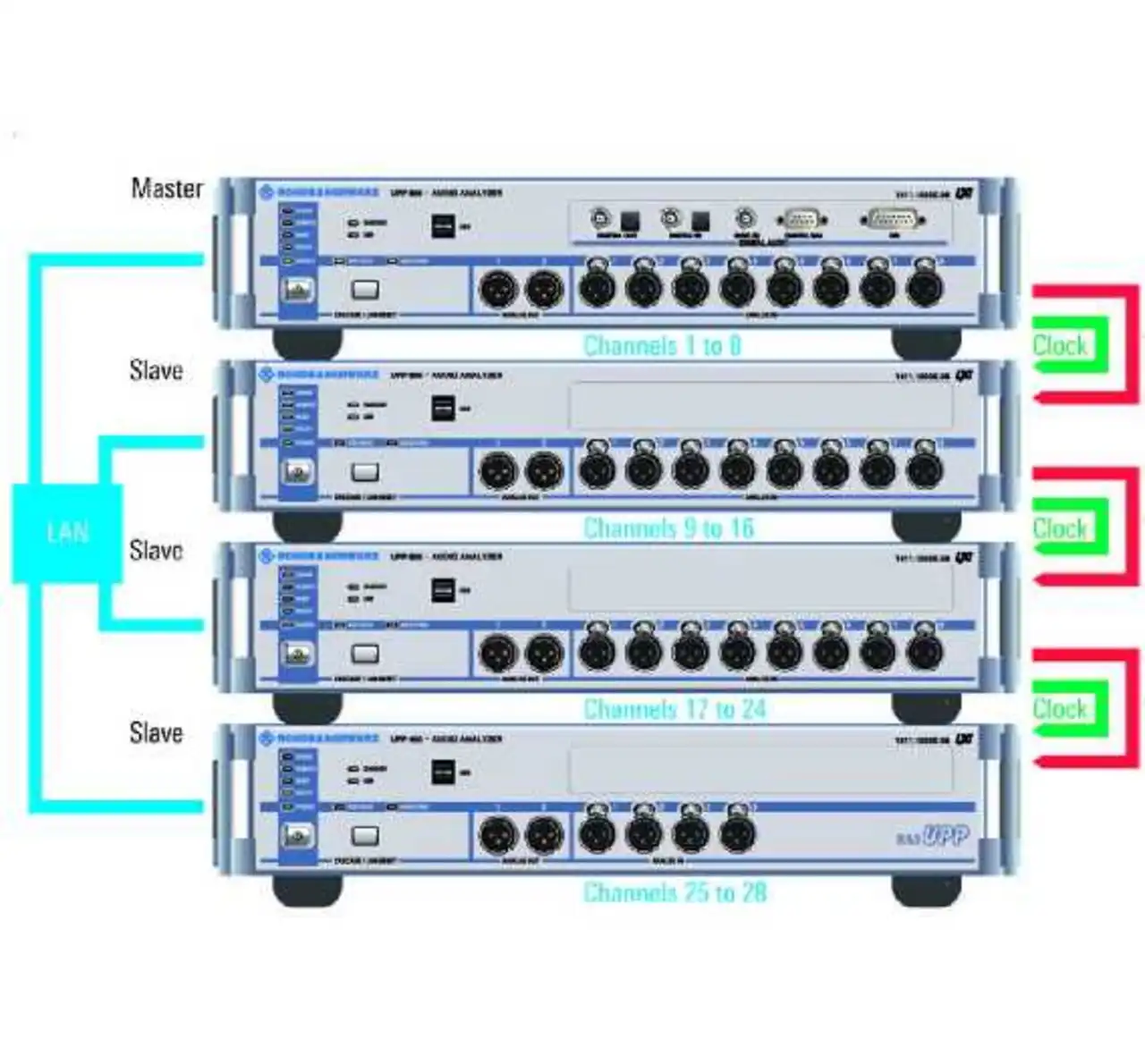 Mehrkanalige Messungen gewinnen in der Audiowelt mehr und mehr an Bedeutung. Daher hat Rohde & Schwarz seine R&S-UPP-Analysatoren so ausgestattet, dass sie zwei, vier oder acht analoge Kanäle parallel analysieren können und zudem nach dem Master-Slave-Prinzip kaskadierbar sind. In der maximalen Ausbaustufe stehen mit insgesamt sechs Analysatoren bis zu 48 Messkanäle zur synchronen Messung bereit. Dabei verhält sich eine Kaskade nach außen wie ein einziges Messgerät. »Solche Mehrkanalmessungen senken die Gesamtmesszeit drastisch gegenüber Geräten, die beispielsweise über Audio-Switcher immer nur zwei Kanäle gleichzeitig verarbeiten können«, verdeutlicht der Experte. »Weil alle Messkanäle synchron arbeiten, sind auch Phasenmessungen zwischen allen beteiligten Kanälen möglich. Interessant sind solche Messungen zum Beispiel bei der Fertigung von Surround-Systemen für den Heimgebrauch oder für Pkw. Schon in Mittelklassefahrzeugen werden die beiden Stereokanäle für die Front- und Fond-Passagiere auf bis zu acht Lautsprecher und die entsprechende Anzahl von Verstärkerkanälen aufgeteilt. So entsteht trotz der schwierigen Akustik und den beengten Platzverhältnissen zur Unterbringung der Schallwandler ein qualitativ hochwertiger Klang.« Aufwändige Soundsysteme in Pkw verwenden Verstärker mit 16 und mehr Kanälen, um Surround-Sound über eine Vielzahl von Lautsprechern in bestmöglicher Qualität zu übertragen. Für diese Anwendung kann der Hersteller mehrere R&S-UPP-Analysatoren zusammenschalten und somit alle Kanäle gleichzeitig messen. Die Analysator-Kaskade bringt nicht nur einen bedeutenden Zeitgewinn bei der Messung von vielkanaligen Prüflingen, sondern vereinfacht zudem die Programmierung, da die gesamte Kaskade wie ein einzelnes, entsprechend mehrkanaliges Messgerät angesteuert wird.