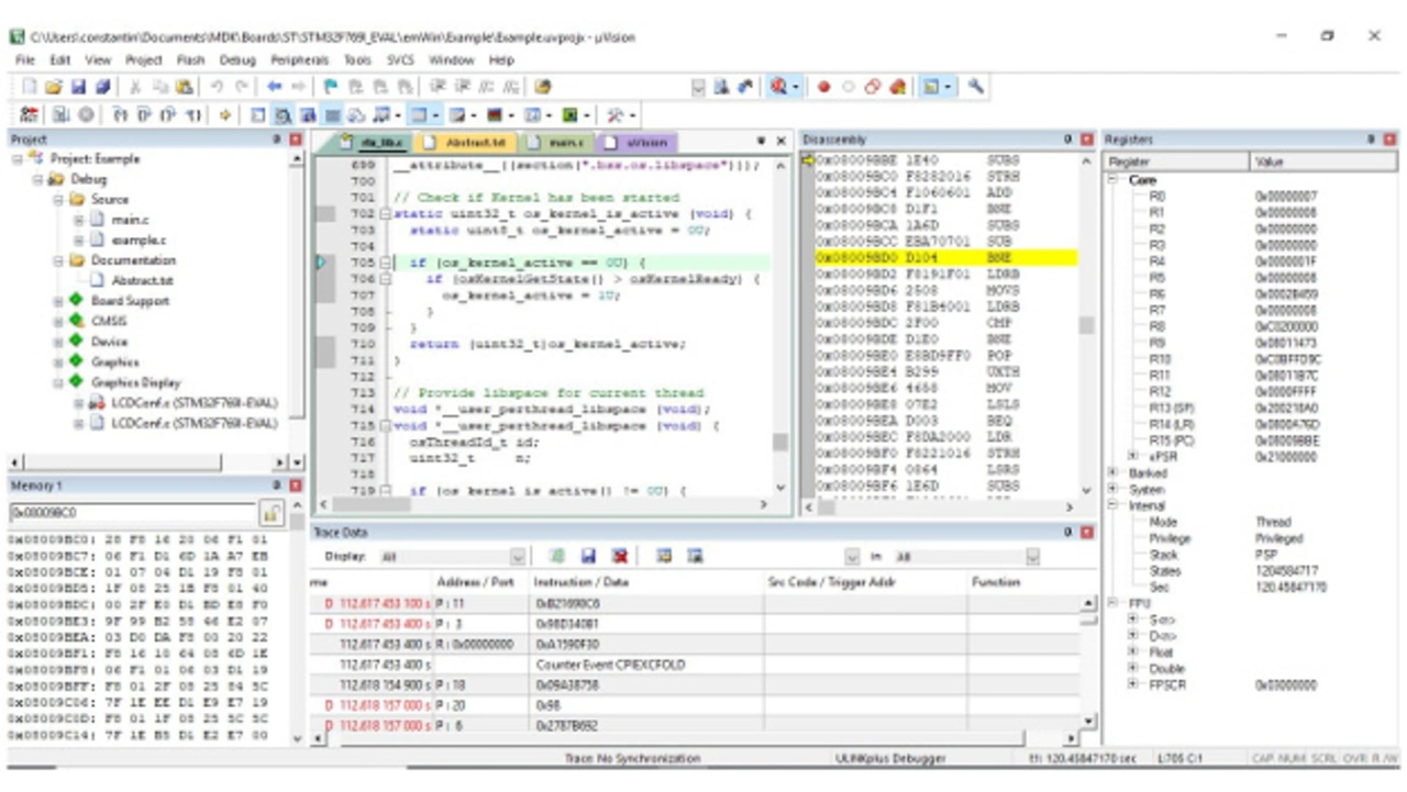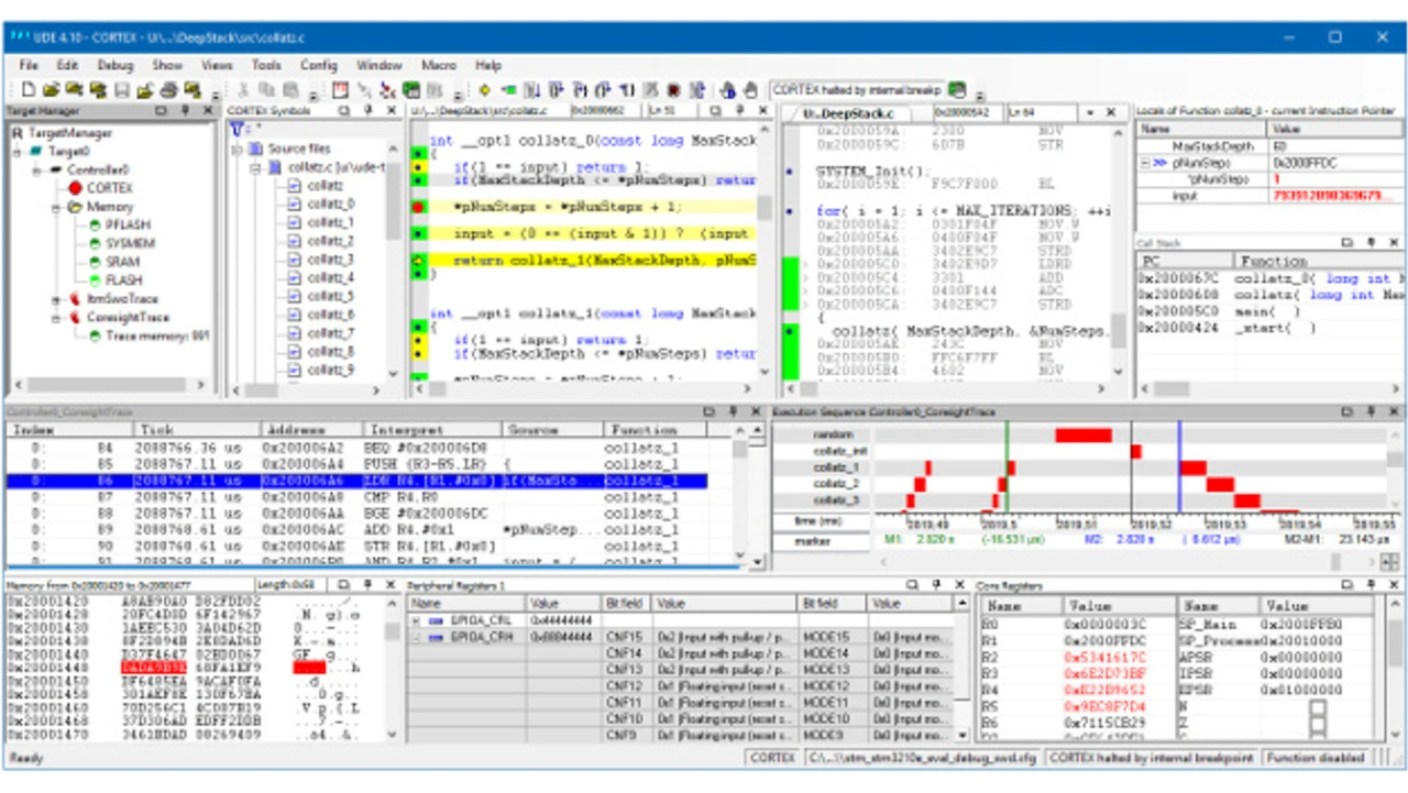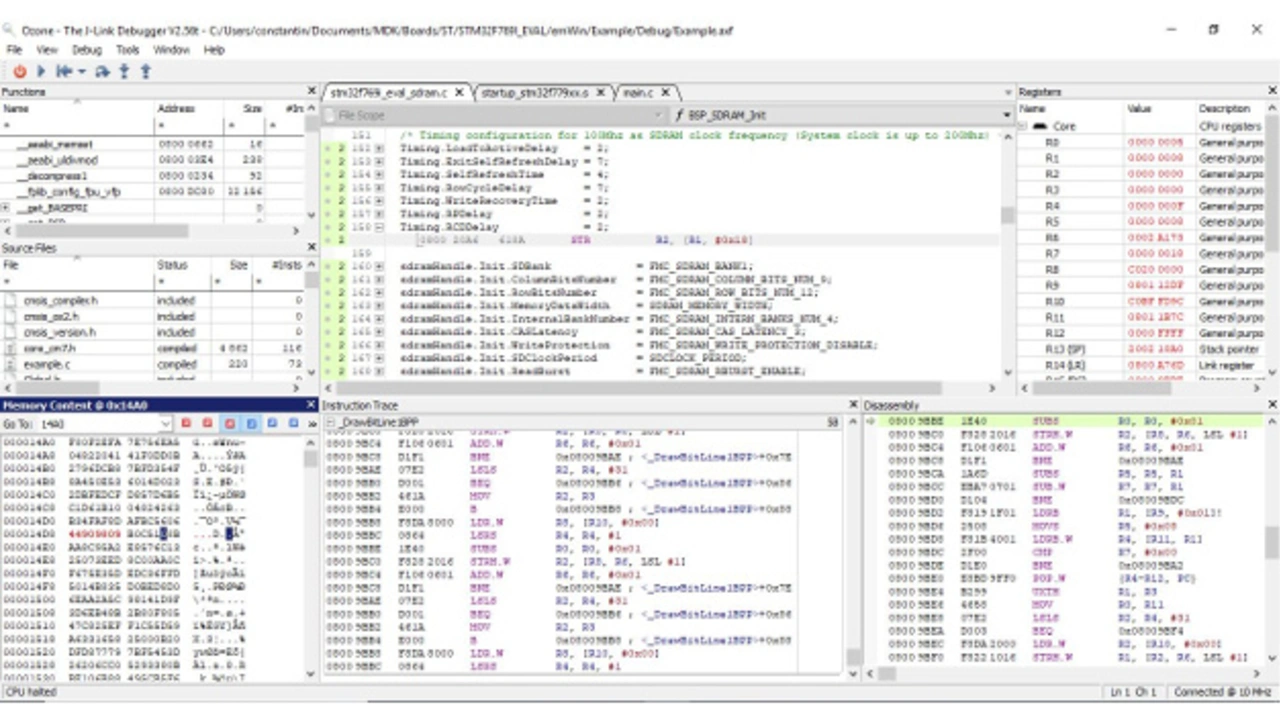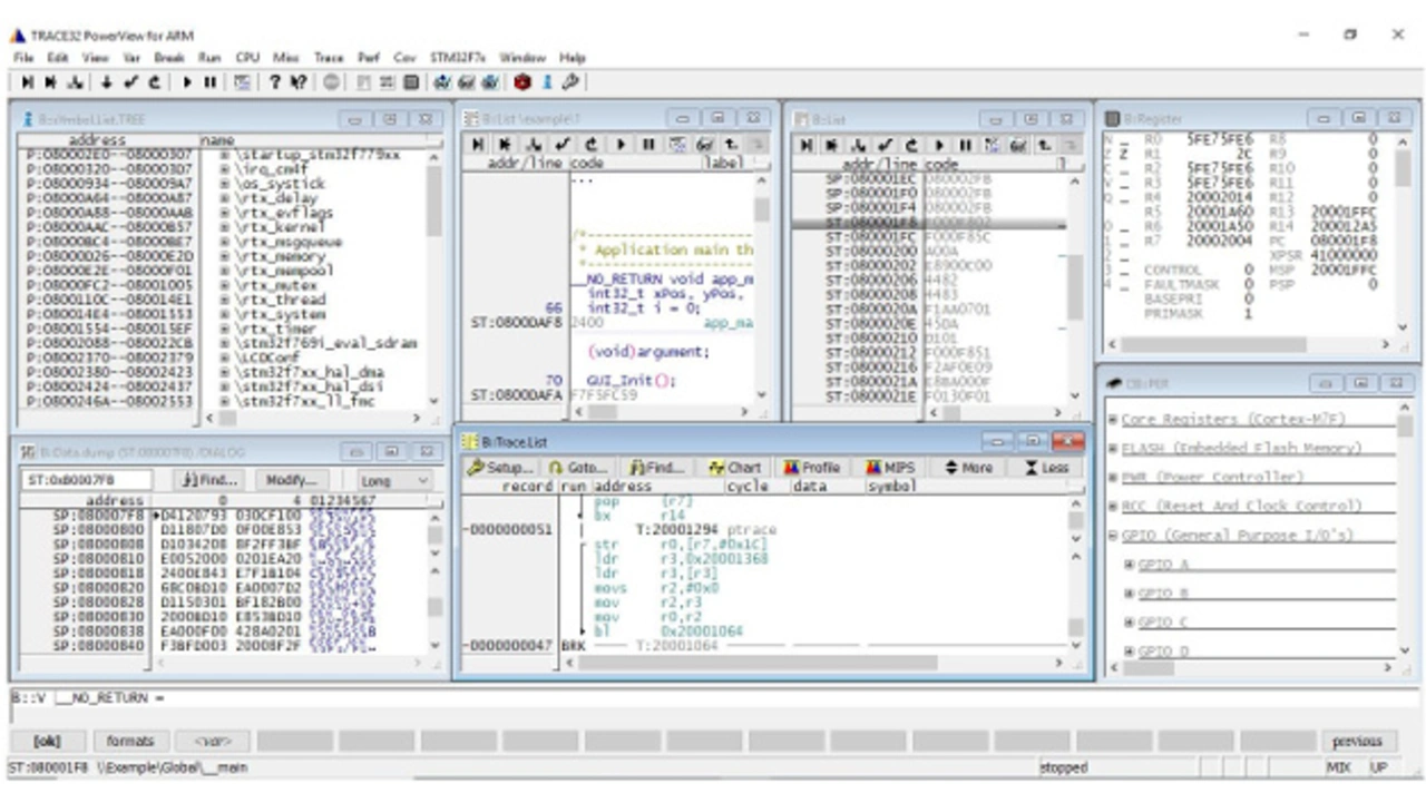 Für jedes der Produkte finden wir eine graphische Nutzeroberfläche (Bild 2a, 2b, 2c, 2d): bei ULink plus das Keil uVision (Bild 2a), für µTrace das PowerView (Bild 2b), J-Trace Pro hat das Ozone-GUI (Bild 2d) und UAD2next ist Teil der Universal Debug Engine (Bild 2c).