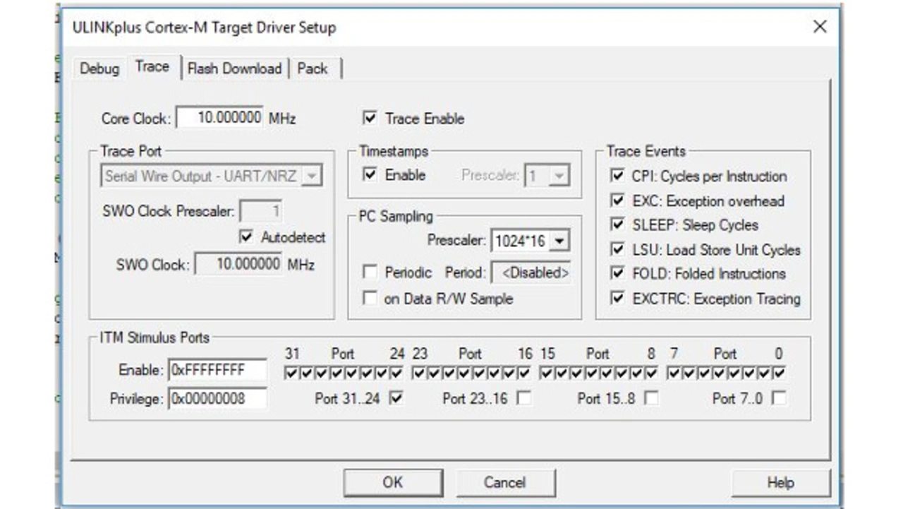 Für den Testcontroller STM32F779NI haben allerdings nur uVision und Ozone eine funktionstüchtige Trace-Konfiguration integriert, in PowerView und UDE müssen die korrekten Parameter noch händisch nachgetragen werden. PowerView hat dazu eine Parametrierkarte, die UDE ein Textfeld. Mit der starken Skriptzentrierung im PowerView könnte auch direkt ein Konfigurationsskript ausgeführt werden, lauterbach.com stellt dafür ein Skriptarchiv (STM32F779NI fehlt, STM32F7526 geht).