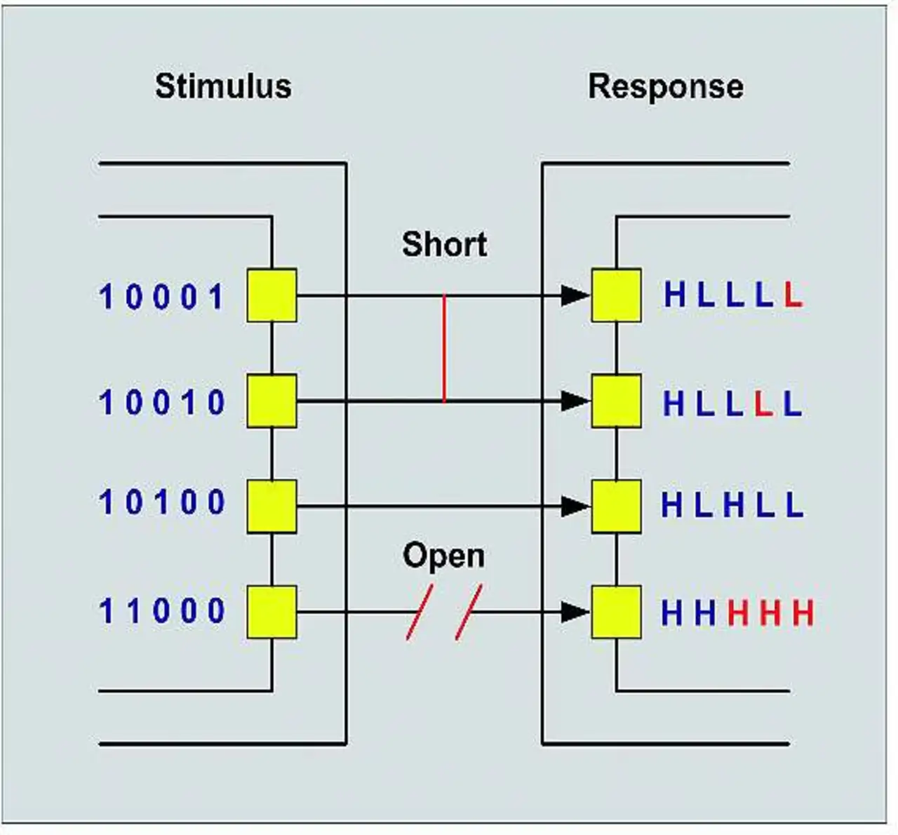 Eine sinnvolle Ergänzung zu herkömmlichen Testverfahren bietet JTAG/Boundary Scan: Viele komplexe digitale Bausteine lassen sich in einen Boundary-Scan-Testmodus schalten, in dem über eine spezielle serielle JTAG-Schnittstelle die Ausgangspegel aller Anschlüsse gesteuert und die Eingangspegel ausgelesen werden können. Nach außen braucht von der Leiterkarte nur eine einzige JTAG-Schnittstelle mit vier Signalen herausgeführt werden, da die Boundary-Scan-Bausteine auf der Karte im JTAG-Pfad hintereinandergeschaltet werden können. Boundary-Scan-fähige Bausteine können sich gegenseitig testen und erwartete Pegel auf Leitungen überprüfen. Ebenso können an solche Bauteile angeschlossene Signale mit bekannten Pegeln getestet werden. So lassen sich typische Produktionsfehler wie offene Lötstellen und Kurzschlüsse direkt finden (Bild 1).