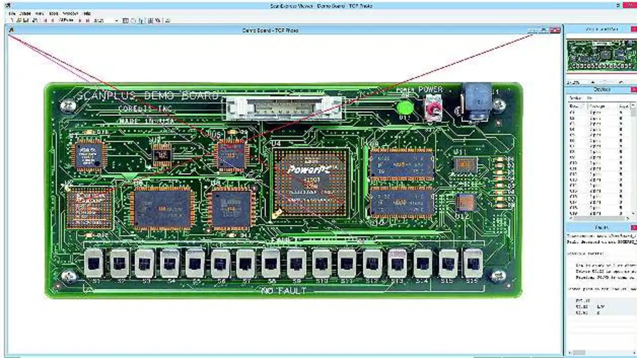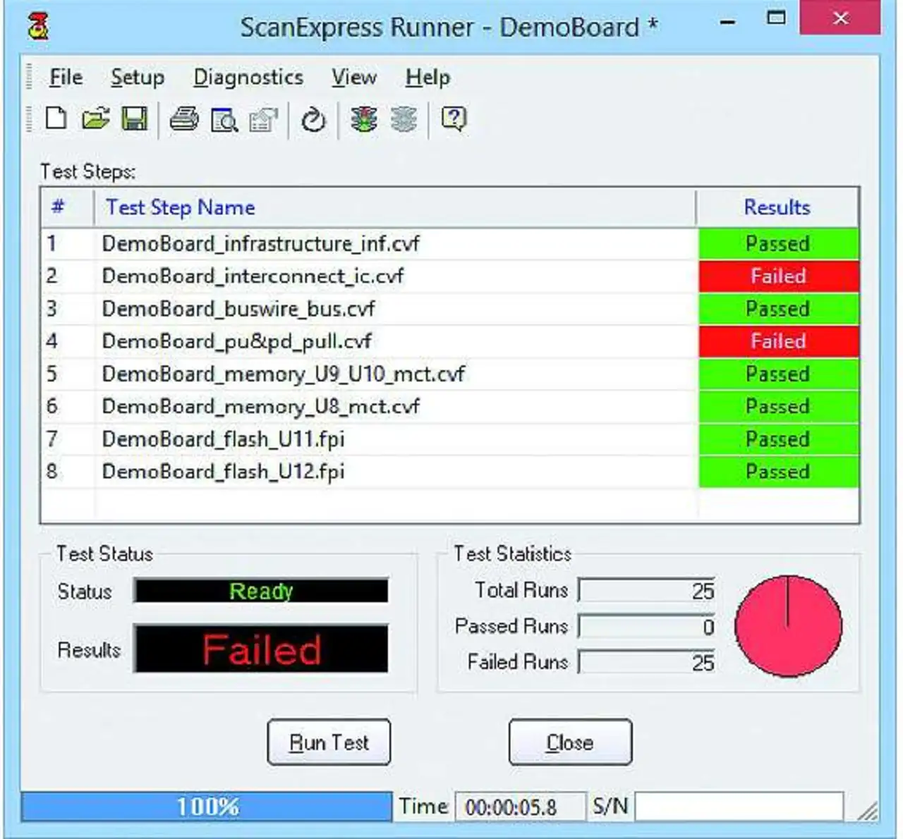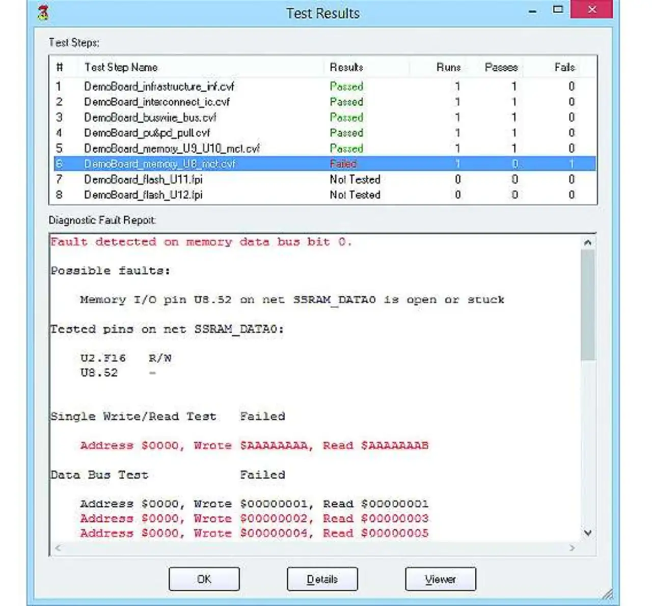 Moderne Software wie der »ScanExpress Runner mit Advanced Diagnostics« (Bild 2) von Corelis erkennt anhand der eingelesenen Eingangspegel den Fehlertyp wie auch die vermutlichen Fehlerursachen und -orte auf der Leiterkarte und gibt diese genau an.