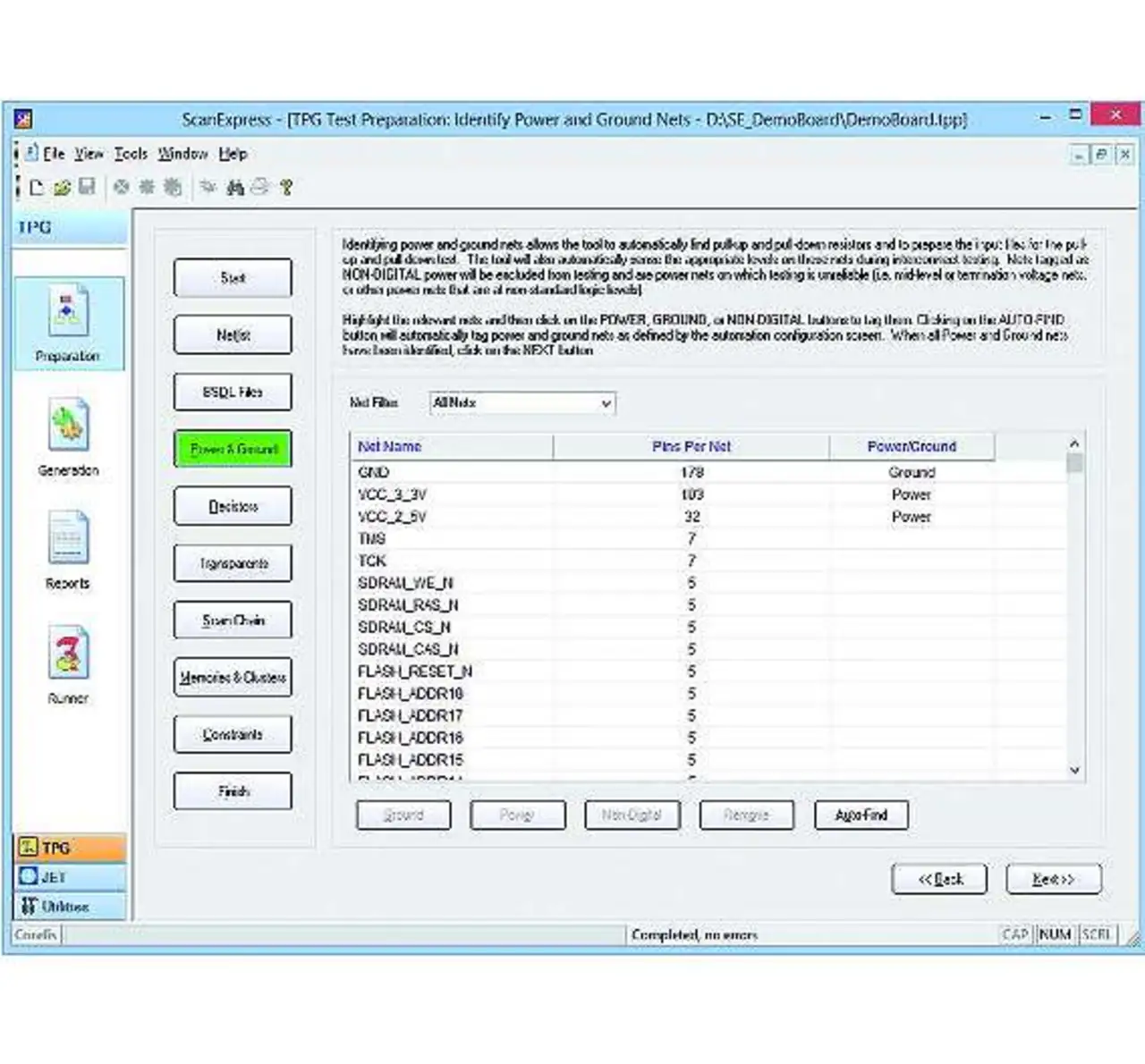 Die Erstellung des Testplans ist noch die schwierigste Aufgabe bei einem Boundary-Scan-Test. Der »ScanExpress Test Plan Generator« (Bild 6) von Corelis führt mit einem Wizard durch alle Schritte bis zum fertigen Testplan. Zuerst liest das Tool Netzliste, Schaltplan und Bauteileliste (BOM) ein, wobei die allermeisten Netzlistenformate unterstützt werden. Im zweiten Schritt werden die BSDL-Dateien der Boundary-Scan-fähigen Bauteile eingelesen. Danach findet die Identifizierung von Versorgungsspannungs- und Massenetzen statt, anschließend die der Widerstände (Pull-ups, Pull-downs und Serienwiderstände). Bei all diesen Schritten erkennt das Werkzeug die Funktion der meisten Bauteile automatisch, es sind nur geringe Nacharbeiten erforderlich. Zuletzt werden Speicherbausteine identifiziert. Das Werkzeug kennt die meisten gängigen Speichertypen; neue Speichertypen werden regelmäßig hinzugefügt, und falls einmal eine Variante noch nicht unterstützt wird, können Kunden unter Wartung die Unterstützung dafür kostenlos anfordern.