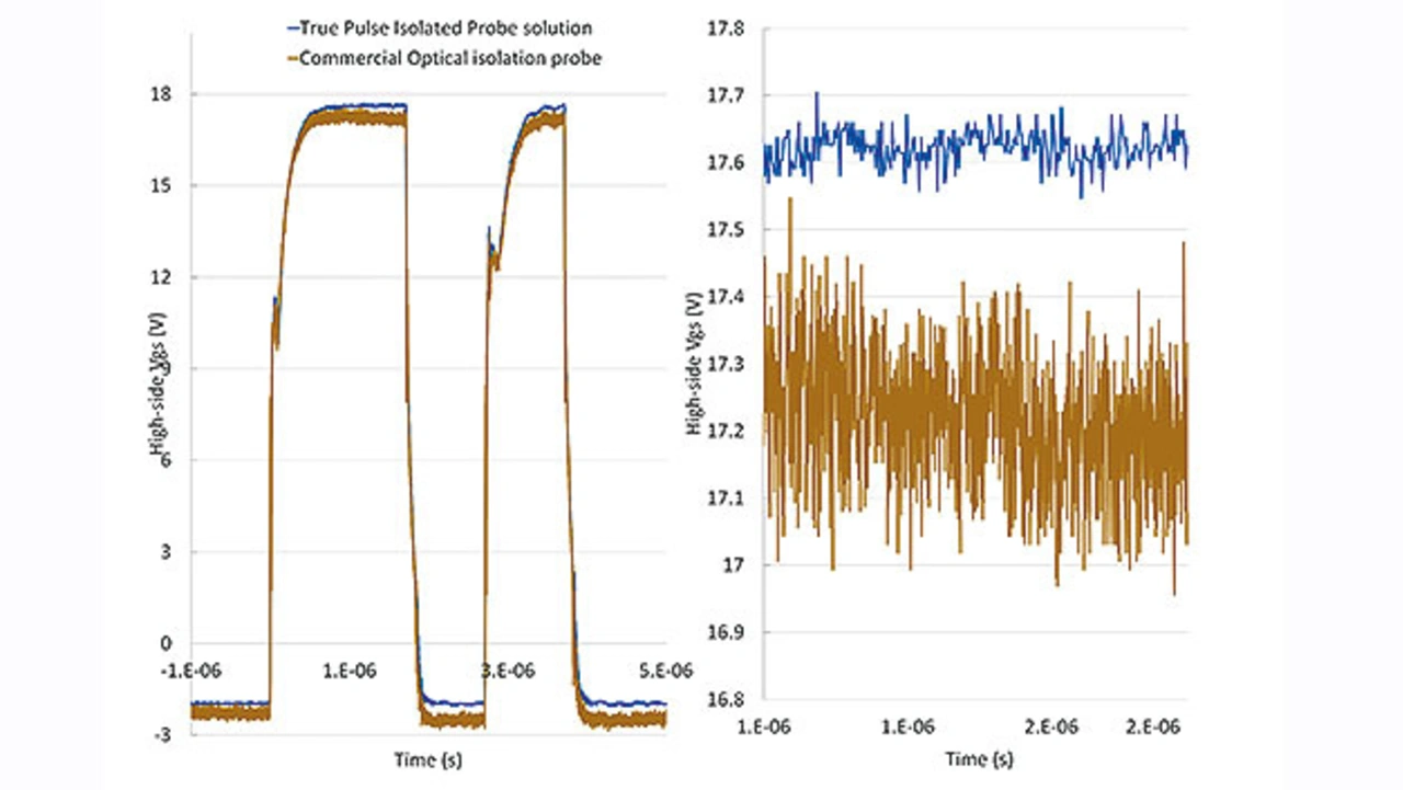 Ein wichtiger Parameter ist die 10-%-Gate-Spannungszeit, und bei 20 V VGS muss man in der Lage sein, 2 V sehr genau zu messen. Das Rauschen muss viel kleiner sein als die gemessene Spannung, <30 mVrms ist also ideal. Handelsübliche Tastköpfe mit hohem CMRR bringen für einen solchen Bereich ein Rauschen von etwa 200 mVrms mit sich, was das richtige Timing erschwert. Bild 2 zeigt den Vergleich des Rauschverhaltens zwischen einem handelsüblichen Tastkopf mit hohem CMRR-Wert und der rauscharmen High-CMRR-Lösung.