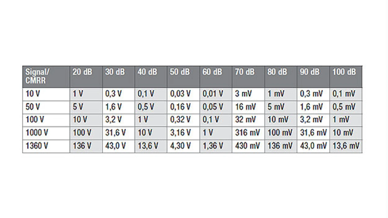 Bei einer Spannungsmessung sollte die Differenzspannung gemessen werden. Das CM-Signal führt jedoch ebenfalls zu einem störenden Messsignal. Die unerwünschten Spannungen aufgrund von CM-Signalen können sehr einfach für verschiedene Gleichtaktunterdrückungen (Common Mode Rejection Ratio, CMRR) berechnet werden, siehe Tabelle 1.