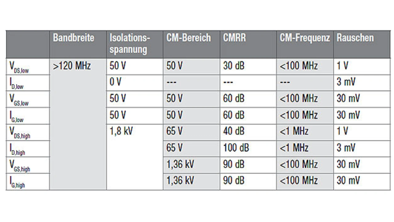 Die kapazitive Last des Tastkopfes muss so klein sein, dass das gemessene Signal nicht wesentlich beeinträchtigt wird. Ein typischer SiC-Transistor hat eine Eingangskapazität im einstelligen nF-Bereich und eine Ausgangskapazität von etwa 100 pF. Daher sind die Lastanforderungen für VDS (einstelliger pF-Wert) strenger als für VGS (zweistelliger pF-Wert ist akzeptabel). Tabelle 2 zeigt die Anforderungen an die Tastköpfe für die Messung eines 1,7-kV-SiC-Moduls.