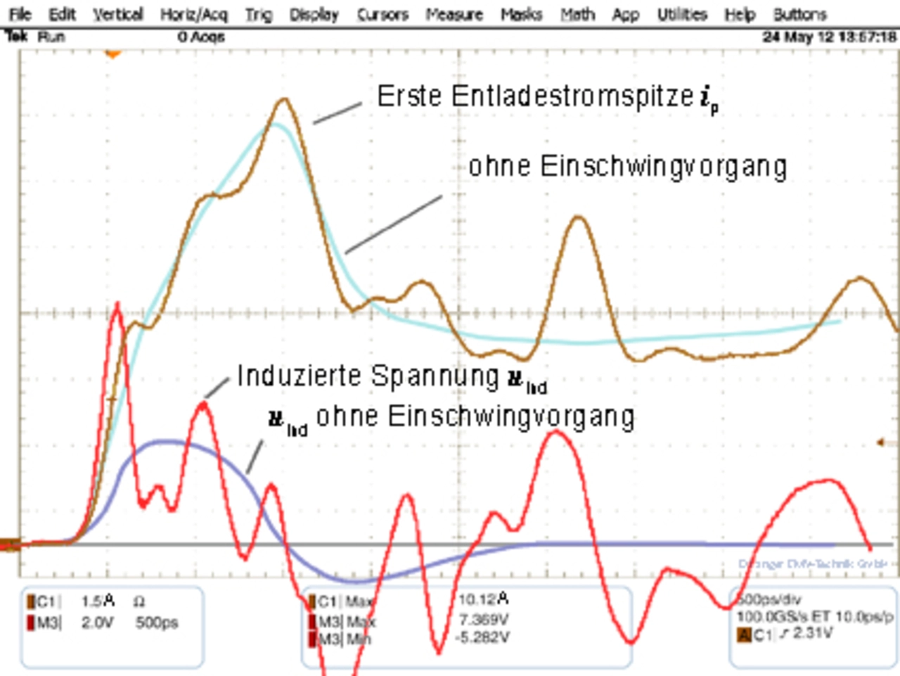Im Bild 3 ist die erste Entladestromspitze des ESD-Generators vergrößert dargestellt. Man erkennt, dass auf der Vorderflanke mehrere Einschwingvorgänge liegen. Im Weiteren wird dieser Vorgang als ESD Einschwingvorgang bezeichnet. Die Entladestromspitze und der ESD Einschwingvorgang erzeugen einen magnetischen Fluss B1 (Bild 1) mit gleichem Zeitverlauf. Der magnetische Fluss B1 induziert in einer Leiterschleife der Elektronikbaugruppe eine Störspannung uind (Bild 3). Die Leiterschleife hat eine Größe von 8 mm2. Die eingestellte Spannung des ESD-Generators beträgt 2 kV. Im Bild 3 erkennt man weiterhin, dass die größte Spannungsinduktion vom ESD Einschwingvorgang erzeugt wird. Der nach Norm definierte 0,7 bis 1 ns Anstieg der Entladestromspitze erzeugt eine geringere Störspannungsinduktion (Bild 3, Kurven ohne Einschwingvorgang).
