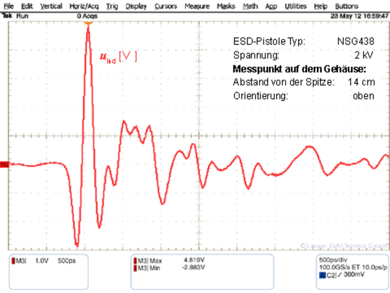 Der ESD Einschwingvorgang des ESD-Generators besitzt eine höhere Störwirkung als die Entladestromspitze. Die nach Norm definierten Kurvenformparameter eignen sich damit nicht zur umfassenden Beschreibung der Störwirkung des ESD-Generators. In der Praxis sind die Einschwingvorgänge stark vom Typ des ESD-Generators abhängig.