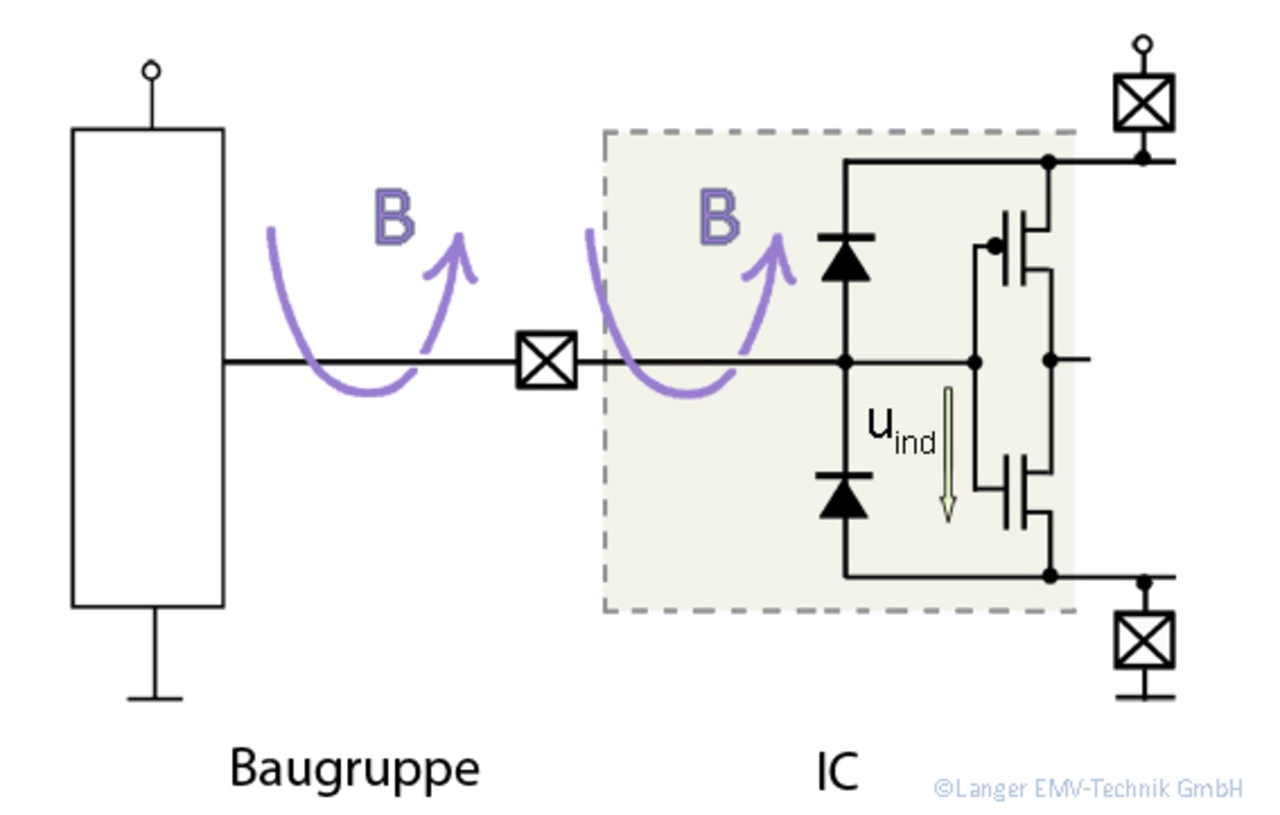 Im Bild 5 ist das Wirkprinzip der Spannungsinduktion (Ersatzschaltung) durch das Magnetfeld B des ESD-Generators dargestellt. Die Induktionsschleife kann sich außerhalb des ICs auf der Flachbaugruppe oder im IC-Gehäuse befinden. Außerhalb wird sie durch einen Leiterzug gebildet, der sich hier zum Beispiel über einen niederohmigen Treiber zur Masse schließt. Durch den Leiterzug wird die Störspannung leitungsgebunden in den IC geleitet. Innerhalb des ICs wird die Induktionsschleife durch Pins, Lead Frame und Bonddraht gebildet. Die in der Induktionsschleife induzierte Spannung uind steht am Eingang des ICs an. Beide Spannungen – die äußere und die innere – wirken im Inneren des ICs störend. Die Spannung uind hängt von der Steilheit des Entladestroms, bzw. des Magnetfeldes des ESD-Generators ab. Dieser Zusammenhang wird mit dem Induktionsgesetz: uind = -d Φ / d t beschrieben. Je steiler der Störvorgang ist, umso höher ist die induzierte Spannung. Beim Burstgenerator IEC 64000-4-4 ist die Steilheit des Impulses 5 ns. Die Magnetfelder des Burstgenerators induzieren eine geringere Spannung als der Störvorgang des ESD-Generators. Der ESD-Generator besitzt eine Flankensteilheit von 0,7 bis 1 ns und wird bei gleichem Strom fünf Mal mehr Spannung induzieren. Die Einschwingvorgänge auf der Flanke des ESD-Generators besitzen eine Steilheit von ca. 200 ps. Diese Einschwingvorgänge werden eine noch höhere Spannung induzieren.