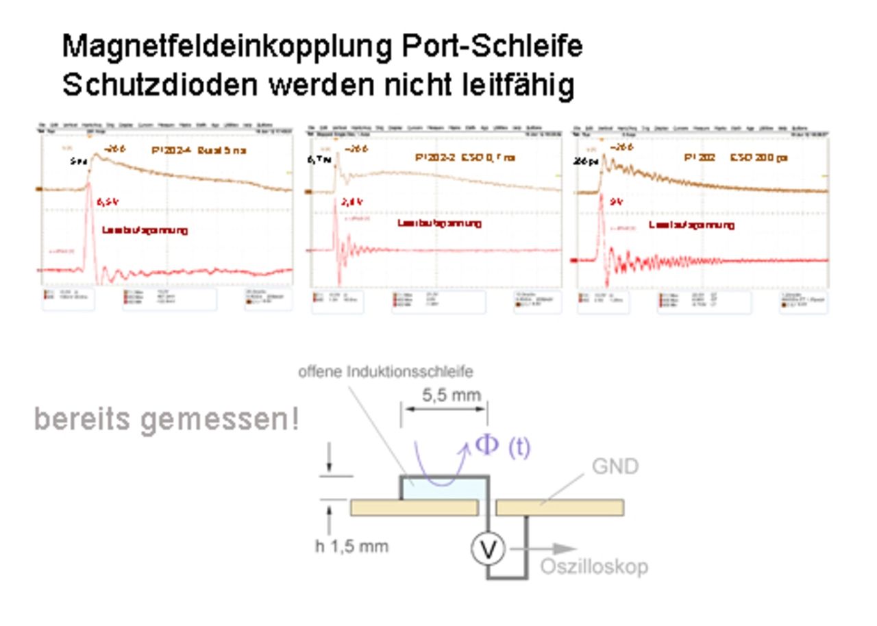 Dieser Zusammenhang ist im Bild 6 dargestellt. Der dargestellte Strom erzeugt ein Magnetfeld B, das die Leiterschleife durchsetzt. In der Leiterschleife wird die Spannung uind induziert. Die Störvorgänge: Burst, ESD, ESD Einschwingvorgang erzeugen unterschiedlich hohe Spannungsinduktionen. Die Breite des induzierten Spannungsimpulses entspricht der Anstiegszeit des Stromes. Bei Burst entstehen Impulse, die 5 ns breit sind. Bei ESD 1ns und beim ESD Einschwingvorgang entstehen Impulse von 200 ps Breite. Bei modernen ICs wird auch bei 200 ps breiten Impulsen der IC die Störung verarbeiten und dadurch gestört. Das kann bis zum Totalausfall des IC führen.