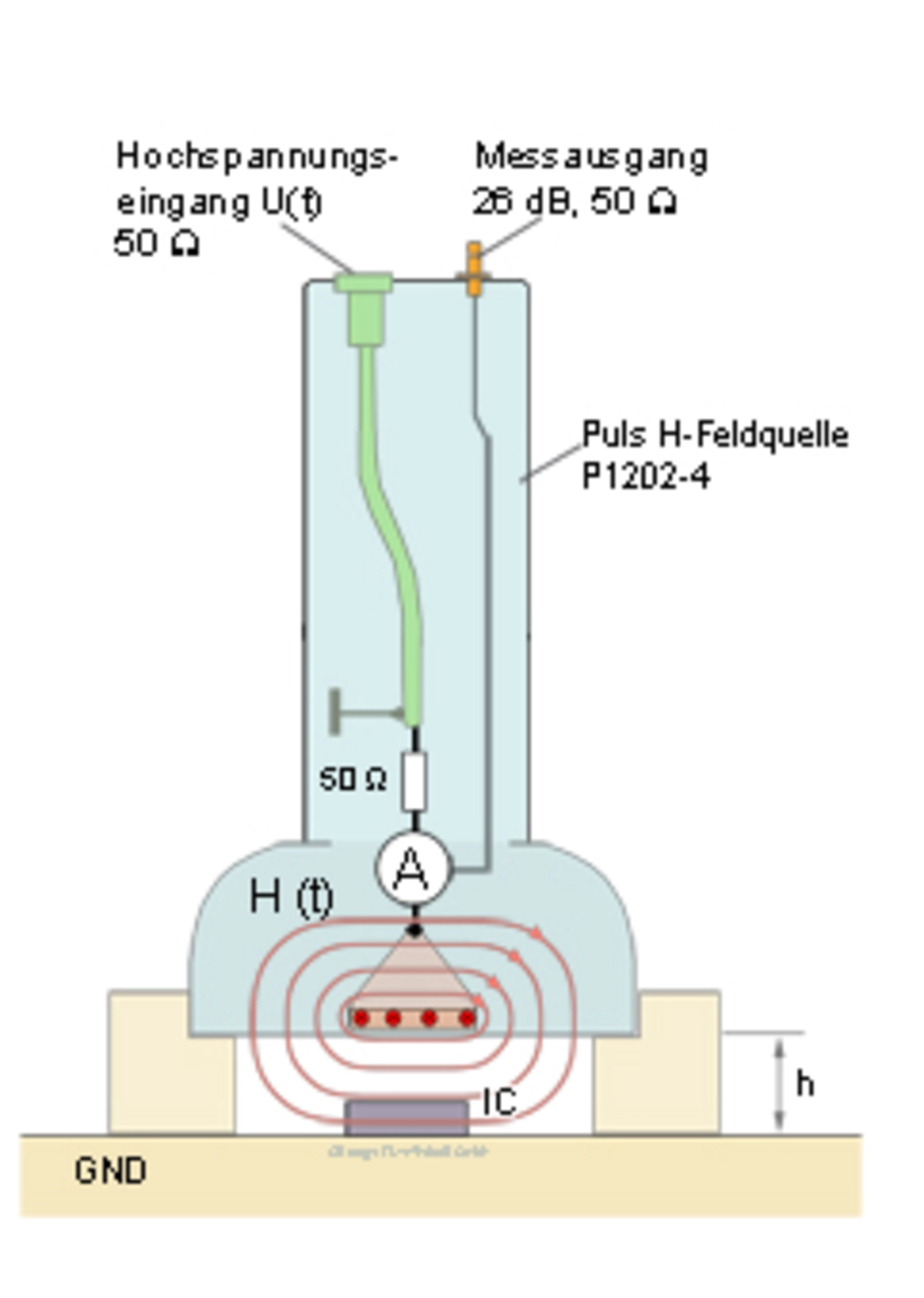Die Höhe der induzierten Spannung ist nach dem Induktionsgesetz umgekehrt proportional zur Steilheit (Anstiegszeit) des Störvorgangs. Die Messungen für Bild 6 wurden mit definierten Feldquellen durchgeführt (Bild 7). Diese besitzen für die unterschiedlichen Störvorgänge eine feste Geometrie für die Felderzeugung. Dadurch wird der Prüfstrom immer die gleiche Feldverkopplung erzeugen. Damit werden die Messergebnisse für die drei beschriebenen Störvorgänge vergleichbar. Ein IC kann den definierten Feldern ausgesetzt werden und seine Störfestigkeit unter Funktion geprüft werden.