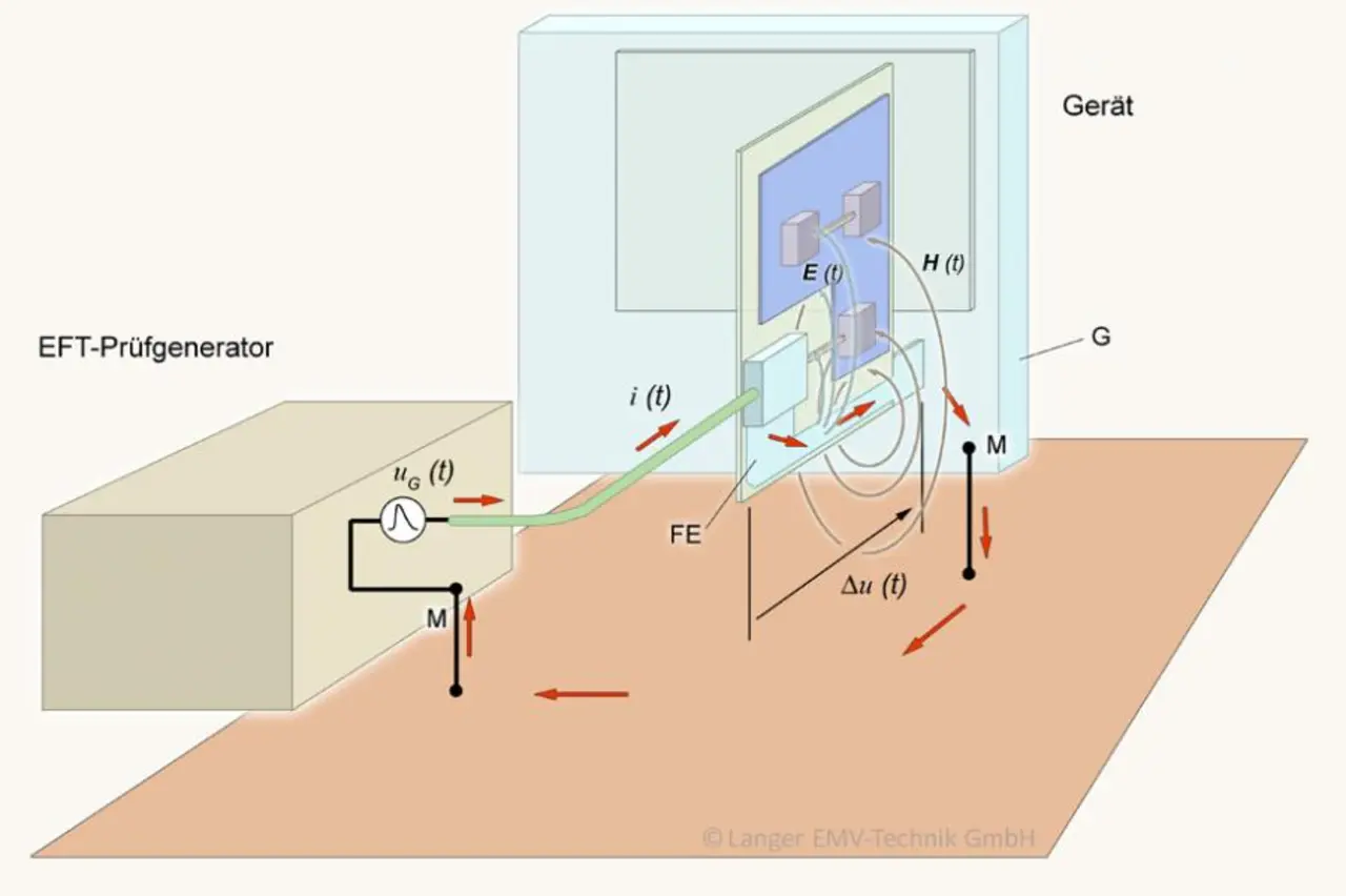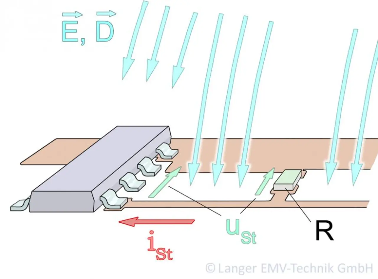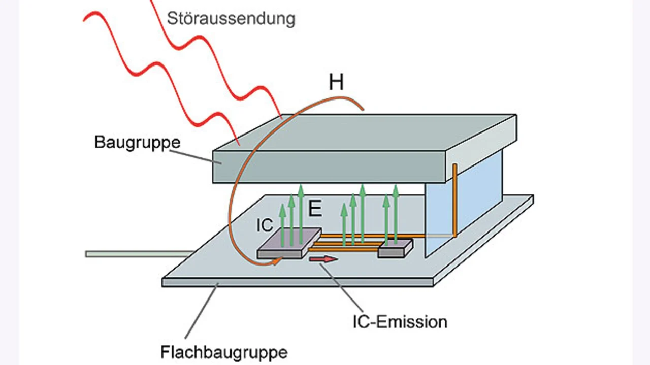 Die Prüfverfahren für Geräte erzeugen im Gerät elektrische und magnetische Felder. Diese Felder wirken auf die Leitungsnetze der Flachbaugruppe, die zum IC führen, und auf die IC-Gehäuse ein. Die Felder, die auf die Leitungsnetze wirken, erzeugen in diesen Ströme und Spannungen. Diese beeinflussen das angeschlossene IC.
