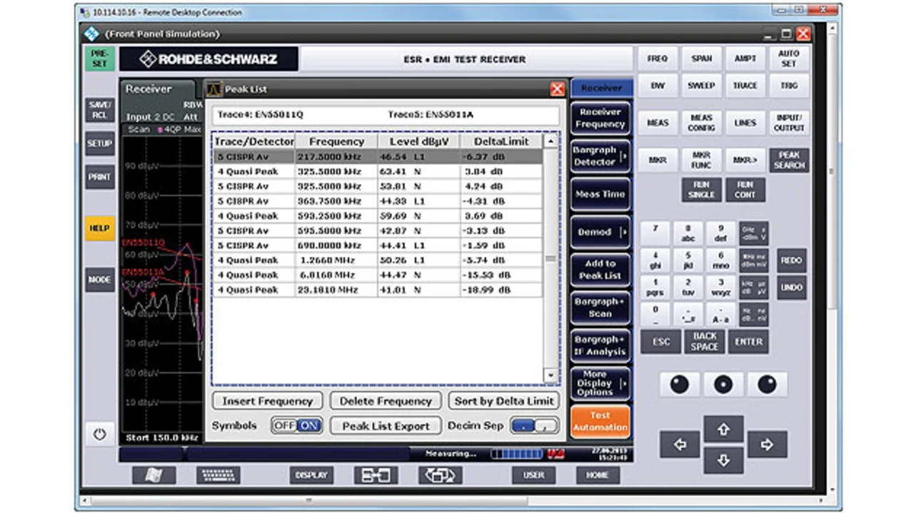 Für die Vormessung stellt der Anwender den Spitzenwertdetektor und den Mittelwertdetektor ein. Die Messzeit pro Frequenzpunkt beträgt beispielsweise 20 ms, und nach zwei bis drei Minuten liegt ein Spektrum vor. Nun sucht der Empfänger für jede Messkurve zum Beispiel die 25 Messwerte, die der Grenzwertlinie am nächsten kommen, und speichert die zugehörigen Frequenzen ab.