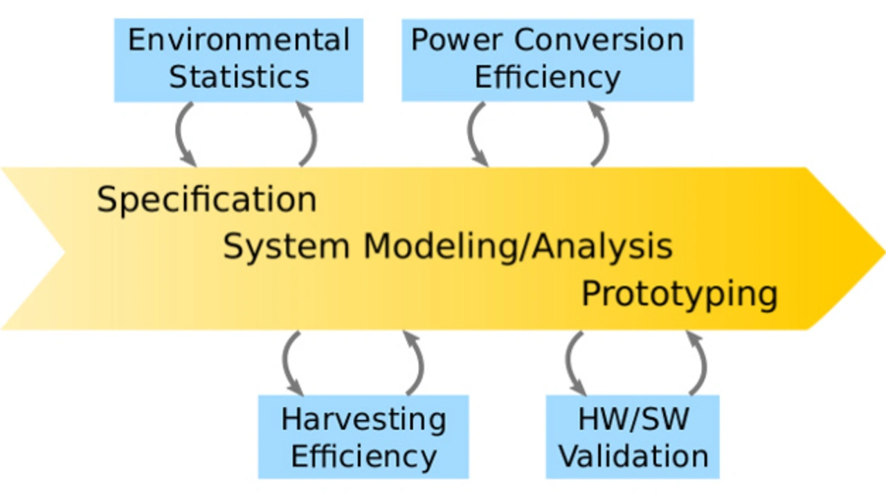 Viele Parameter nehmen direkten Einfluss auf einen autonomen, harvestingbetriebenen Sensorknoten. Die Übertragungs- und Umwandlungseffizienz hängt beispielsweise stark von Umgebungsparametern wie Licht, Bewegung, Temperatur oder Druck ab. In vielen Fällen, z.B. bei tragbaren oder integrierten Geräten, gestaltet sich die Umgebung nicht als leicht-vorhersagbare Variable: Deshalb erfolgen zur repräsentativen Statistik zahlreiche in-situ-Messungen, die in den embedded-Entwurfsprozess (Bild 1) einfließen.