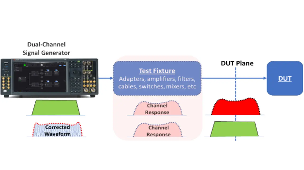 Um das SNR in einer Empfänger-Testlösung zu verbessern, ist der Einsatz von Signalgeneratoren mit höherer Ausgangsleistung pro EVM und ACLR notwendig. Darüber hinaus ist die Kalibrierung auf Systemebene auch entscheidend für die Korrektur von Phasen- und Betragsverschiebungen auf Systemebene über die Bandbreite der Messung. Eine korrigierte Wellenform wird für Kanalantwortprobleme auf der Ebene des Prüflings (Device under Test, DUT) korrekt behandelt (siehe Bild 2).