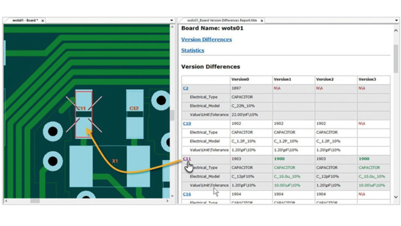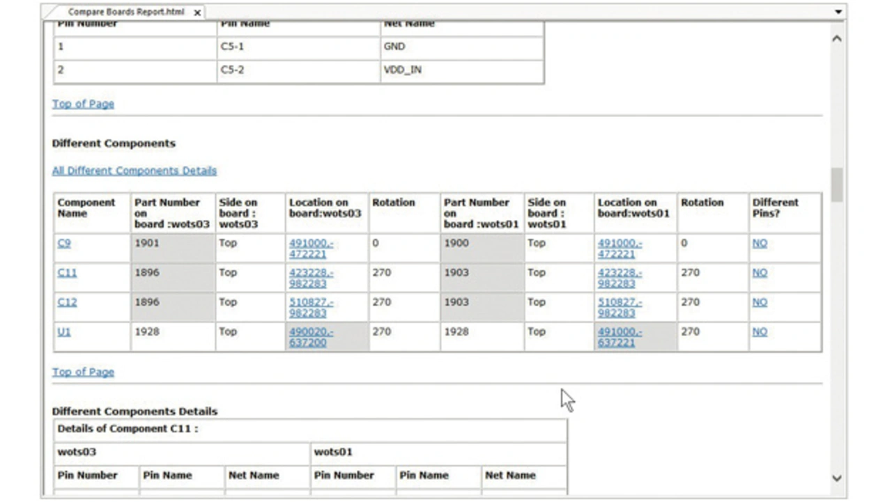 In den CAD-Daten werden alle Revisionen eingetragen. Importiert man diese Daten in C-LINK, erkennt die Software die Unterschiede im Layoutstand. Mit dieser Compare-Boards-Funktion ist innerhalb weniger Momente ein detaillierter Report verfügbar. Die Differenzen werden in übersichtlicher Tabellenform aufgelistet und im Layout angezeigt. Dabei findet die Software sowohl Unterschiede bei den Bauteilwerten und in der Netzliste als auch entfallene und hinzugekommene Bauteile. Damit kann der Testingenieur rasch eine realistische Aussage über nötige Änderungen im Testprogramm treffen.
