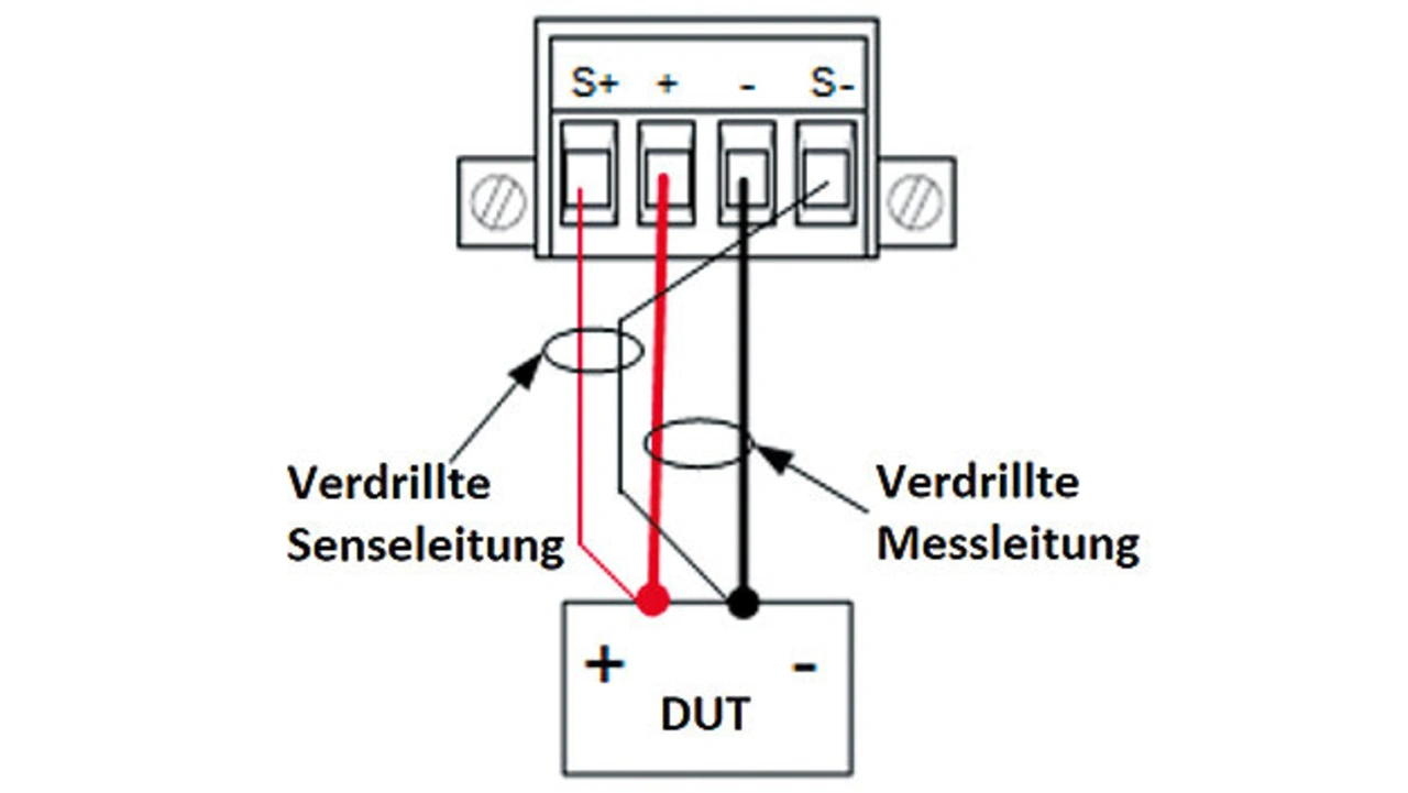 Das wird erreicht, weil über die Sense-Verkabelung der Spannungsabfall am DUT direkt mit einem hochohmigen Voltmeter vermessen wird. Dank der Hochohmigkeit fließt fast kein Strom durch die Sense-Leitungen, und der Spannungsabfall beträgt dadurch in den Sense-Leitungen nahezu 0 V, sodass der genaue Spannungsabfall direkt am DUT ermittelt werden kann. Die Einstell- sowie Rückmessgenauigkeit am Netzteil ist durch den Sense-Anschluss sehr hoch, was ohne diese zusätzliche Verdrahtung nicht der Fall wäre. Hierbei ist zu empfehlen, dass sowohl die Messkabel verdrillt werden und die Sense-Verkabelung separat ebenfalls verdrillt wird. Außerdem sollte die Sense-Verkabelung so kurz wie möglich sein und einen kleinen Widerstand aufweisen.