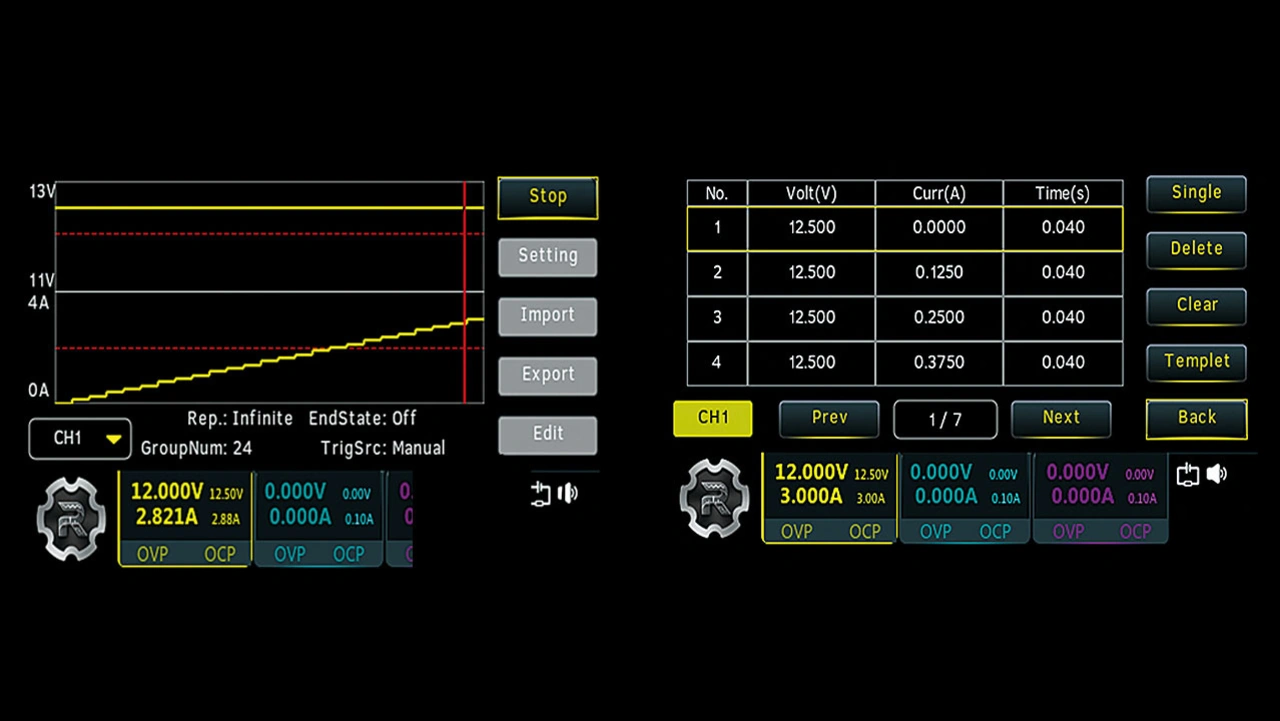 In vielen Bereichen ist es wichtig, die Spannung oder den Strom in einem vordefinierten Muster auszugeben, um die entsprechenden Versorgungsmuster durch die jeweiligen Aktivitäten nachzubilden. Im Netzteil DP2031 von Rigol ist ein Arbiträr-Generator (ARB) integriert, um die Ströme oder Spannungen in einer beliebigen Wellenform auszugeben. Hier sind auch einige Templates wie beispielsweise eine Sinusform integriert, die dann mit der benötigten Schrittweite und Frequenz erstellt werden können. Alternativ kann der Anwender auch ein am PC selbst erzeugtes beliebiges Signal in das Gerät eingeben. Die minimale Schrittweite beträgt bis zu 1 ms zwischen den einzelnen Ausgabepunkten – somit lassen sich Spannungs- oder Stromänderungen in einem sehr schnellen Bereich ändern. Bis zu 512 Punkte sind dafür definierbar.