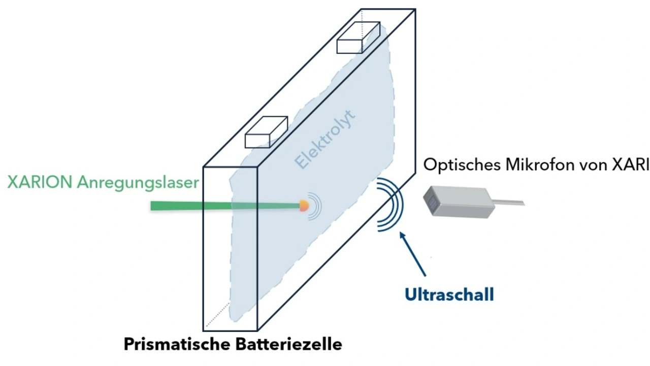 ...erlaubt die automatisierte, kontaktfreie Messung der Elektrolytverteilung in einer neu produzierten Batteriezelle. Das ist wichtig, weil die Qualität und die Lebensdauer der fertigen Batterie entscheidend von der gleichmäßigen Benetzung der Elektroden und Separatoren mit Elektrolytflüssigkeit abhängig sind. Xarion arbeitet hierfür mit einem Laserstrahl, der eine Ultraschallwelle im Prüfling erzeugt, während das Optische Mikrofon auf der gegenüberliegenden Seite der Batterie detektiert, wie gut der Schall von der Batterie geleitet wird. Trockene Bereiche der Batteriezelle reflektieren den Schall, während mit Elektrolytflüssigkeit benetzte Bereiche den Schall leiten. »Wir können hier vor allem auch die deutlich höhere Auflösung und Messgeschwindigkeit unserer Technologie, verglichen mit konventionellen Luftkopplern, ausspielen«, sagt Wallner.