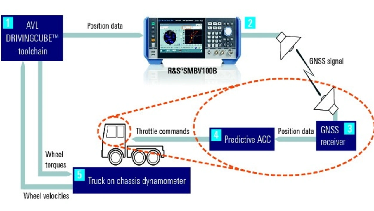 Mit einem GNSS-Simulator lässt sich die Validierungsumgebung erweitern, sodass man das im Fahrzeug integrierte GNSS-System mit realen GNSS-HF-Signalen stimulieren kann. Somit können navigations- und kartenbasierte Funktionen für ADAS und autonomes Fahren wie der prädiktive Abstandsregeltempomat (ACC) oder der Hub-to-Hub-Betrieb (H2H) getestet werden.