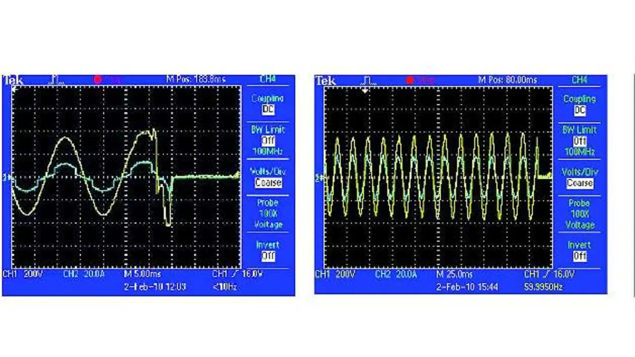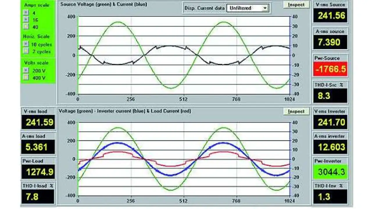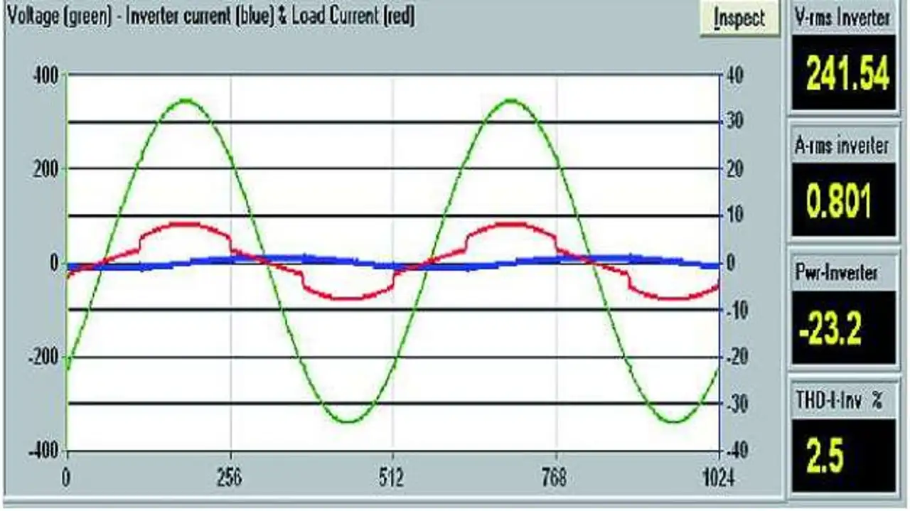 Wenn der Umrichter auf die 240 V/60 Hz synchronisiert, speist er etwa 0,8 A Strom ein, der um etwas mehr oder weniger als 90° nacheilt, woraus -23 W beziehungsweise +23 W Leistung resultieren (Bild 2).