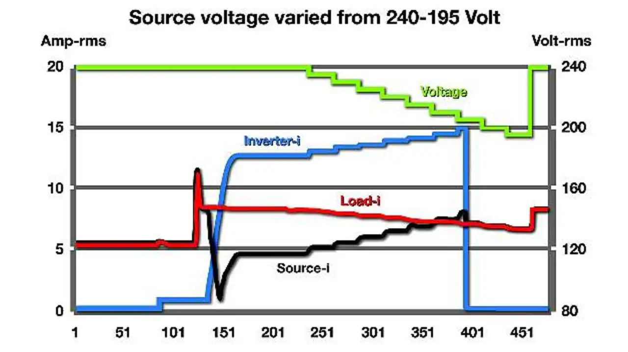 Die AC-Quelle ist so programmiert, dass sie in 5-V-Schritten von 240 V bis auf 195 V herunterregelt (Bild 4). Die »Schrittfolge« startet etwa zwanzig Sekunden nachdem sich der Umrichter synchronisiert hat und am Netz ist. Die horizontale Achse in Bild 6 gibt 500 Messfenster von 0,2 s wieder, wobei der gesamte Test etwa 100 s gedauert hat. Die Last wurde von 5 A auf 8 A (linke Achse) etwa 25 s nach Beginn der Datenerfassung erhöht. Innerhalb nur weniger Sekunden ist der Wechselrichter am Netz und liefert Strom. Mit reduzierter Quellspannung erhöht der Umrichter die Stromzufuhr auf fast 15 A. Wenn die Spannung unter die für diesen Wechselrichter definierten 211 V fällt, dann geht dieser offline und die AC-Quelle übernimmt den Laststrom. Nach dem letzten Schritt der Transienten-Liste kehrt die Spannung auf 240 V und der Laststrom auf seinen Nennwert von 8 A zurück.