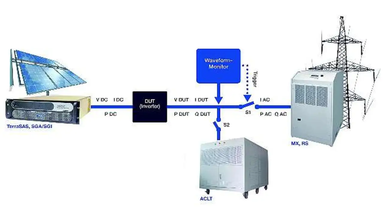 Ein weiterer Test, der eine AC-Quelle mit regenerativem Betriebsmodus benötigt, ist der Anti-Island-Test nach IEC 62116, UL1741, VDE AR-N 4105 und VDE 0126-1-1 (Bild 5). Für diesen Test muss sich die AC-Quelle selbst vom Wechselrichter und der Last trennen, während die Last perfekt ausbalanciert ist, es also keinen Stromfluss in die Quelle gibt. Als regenerative AC-Quelle dient in diesem Fall wiederum die MX/RS-Serie, als DC-Quelle dient ein Photovoltaiksimulator der Serie »TerraSAS« und eine RLC-Präzisionslast »ACLT« des Herstellers Kenninet (Vertrieb: CompuMess Elektronik).