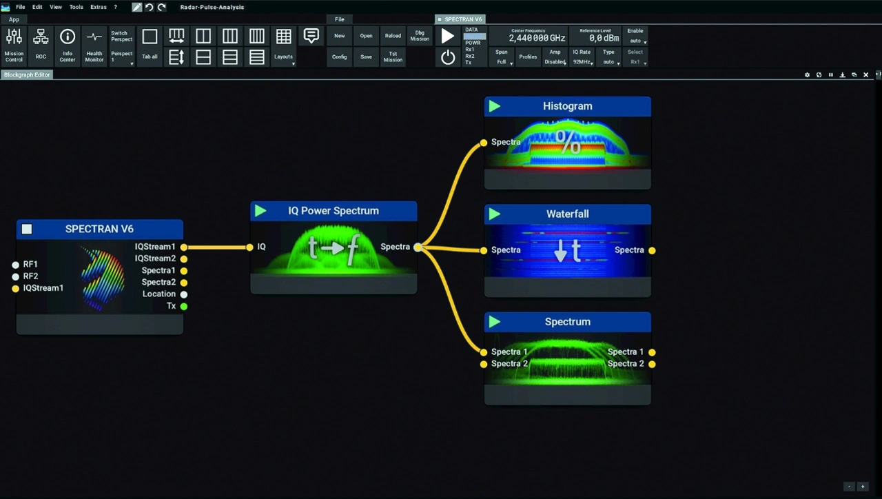 Trotz aller Komplexität ist die RTSA-Suite Pro intuitiv per Drag & Drop konfigurierbar, um unterschiedlichste Hardware zu verbinden und Einstellungen oder Ansichten individuell anzupassen. Dabei werden einzelne Blöcke so zusammengesetzt und miteinander verbunden, dass quasi ein visuelles Abbild des Messaufbaus als Blockdiagramm entsteht. Aaronia nennt dies »Missions«. Auf diese Weise ist jede Messaufgabe schnell und einfach realisierbar. Häufig benötigte Messaufbauten werden einfach als fertige Mission gespeichert und können somit jederzeit wieder aufgerufen werden.